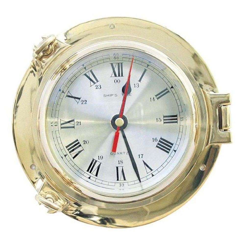 Bullaugen Uhr Messing, Uhr mit Elektrowerk und zentrale Sekunde aus poliertem Messing 18 cm. Das Gehäuse besteht aus Messing und ist auf Hochglanz poliert. Die Uhr hat ein helles Ziffernblatt mit römischen und arabischen Zahlen und schwarzer Zeiger mit einer zentralen roten Sekunde. Dieser Artikel gehört zu unserer Exclusiven Luxus Bullaugen Kollektion. In dieser Serie besitzt jedes Instrument ein schweres und massives anlaufgeschütztes und geschlossenes Messinggehäuse. Jedes Instrument hat zwei Verschluss Schrauben ein Scharnier und verdeckte Bohrungen. Die Uhr hat ein Elektrowerk (Batterien werden nicht mitgeliefert).