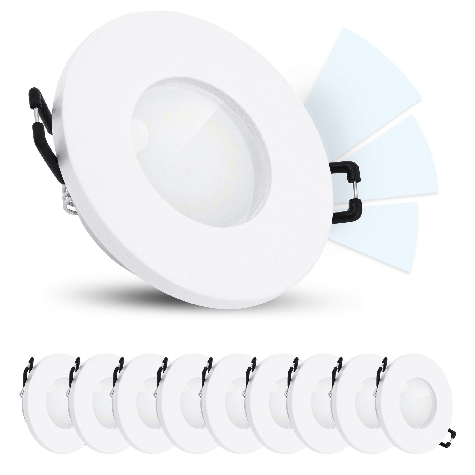 Lieferumfang | 10x Einbaurahmen IP65 weiß rund10x LED fourSTEP 5W neutralweiß10x GU10 Fassung |