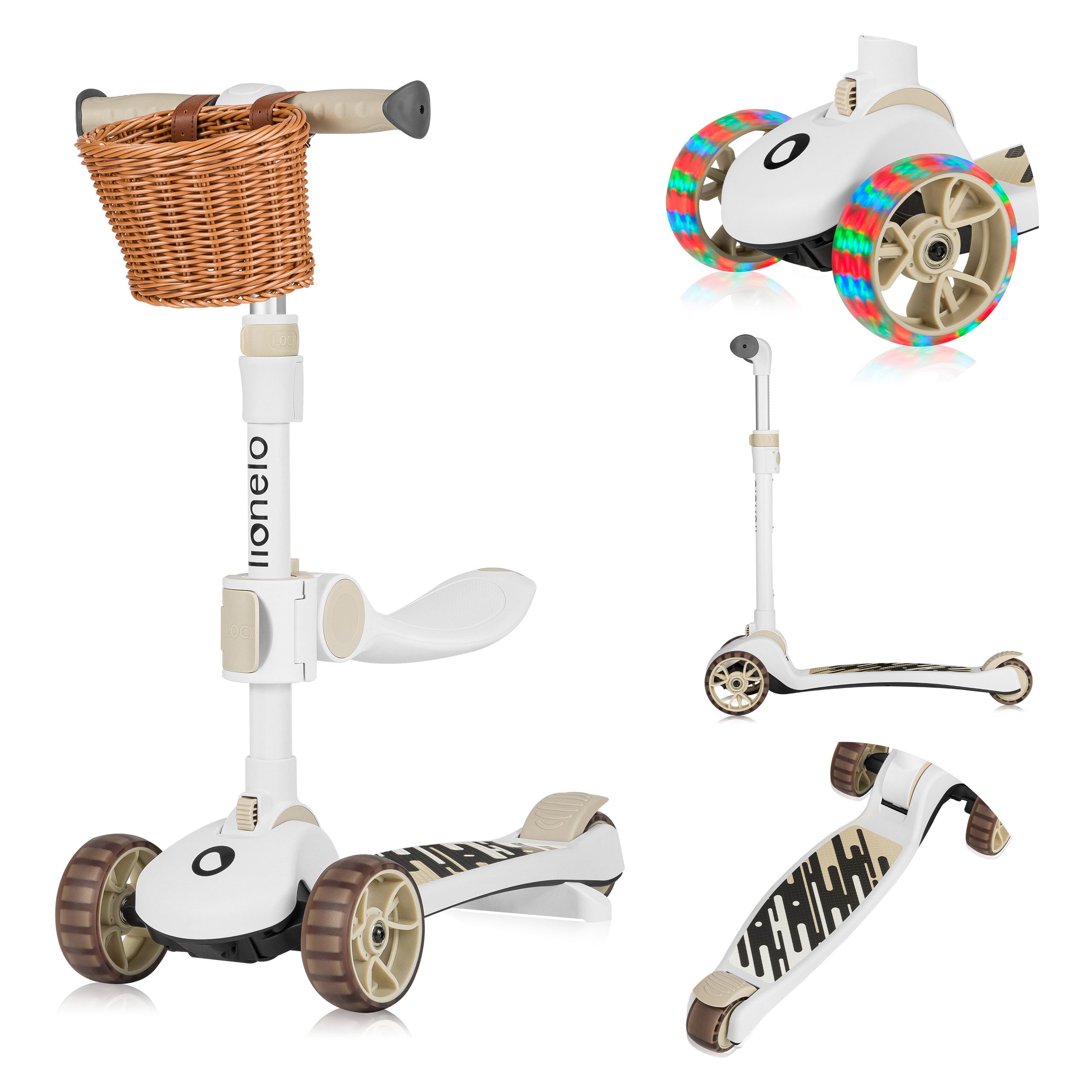Ausstattung | 2 in 1: erstes Dreirad und Scooter abnehmbarer Sitz mit Höhenverstellung stufenlose Höhenverstellung des Lenkers in einem weiten Bereich Korb für kleine Gegenstände glasfaserverstärkte Komponenten Bremse mit Stahlbelag ergonomisches Design des Scooters beleuchtete große Räder Komfortgriffe bewegungsaktivierte und elektrische LED-Beleuchtung in den Rädern Möglichkeit, das Produkt zusammenzulegen, ohne den Lenker zu entfernen Plattform mit rutschfester Oberfläche Lager: ABEC-9 Doppeltes, sicheres und stufenloses Lenkerhöhenverstellsystem von 58 bis 82 cm |