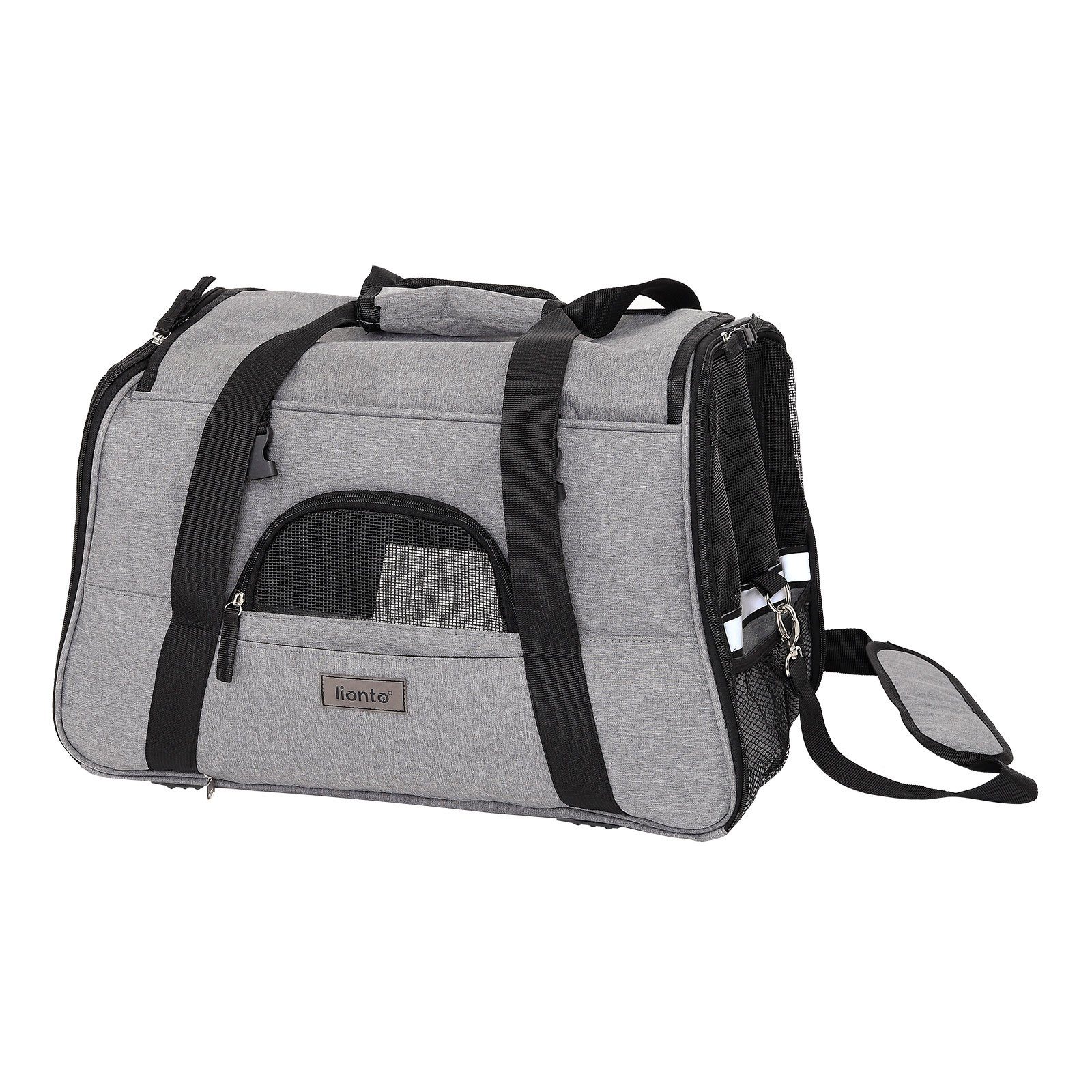Diese praktische Transportbox eignet sich hervorragend für den Transport von Hunden und Katzen zu Tierarztterminen oder bei gemeinsamen Ausflügen und Reisen. Die großzügigen Belüftungsflächen, die gleichzeitig die Zugänge zu Ihrem Haustier darstellen, sorgen für eine optimale Luftzirkulation auch bei längeren Reisen. Die Hundetransporttasche ist seitlich und oben per Reißverschluss zu öffnen. Zusätzliche Befestigungsclips und ein Klettverschluss für die Dachabdeckung verhindern das eigenständige Öffnen durch Ihren Liebling. Durch Öffnen des unteren Reißverschlusses an einer Seite entsteht Platz für den Griff Ihres Koffers und auch die Размер macht diese Box zu einer idealen Flugzeugtasche für Ihren tierischen Begleiter. Für Ihren Tragekomfort gibt es sowohl Tragegurte als auch einen Schultergurt mit einer integrierten Namensschildvorrichtung. Ausgestattet mit einem kuscheligen Liegekissen eignet sich diese Transporttasche auch als allgemeiner Liege- und Rückzugsort. Zwei Seitentaschen können für benötigte Utensilien wie Leine oder Leckerlis verwendet werden. Für die nötige Sicherheit sorgen seitliche Reflektorstreifen, eine Befestigungsleine im Inneren der Tragetasche und Vorrichtungen für die Befestigung des Autosicherheitsgurtes. Wird die Hundetransporttasche mal nicht benötigt, lässt sie sich mit wenigen Handgriffen zusammenfalten und leicht verstauen. Die vorgegebene Belastungsgrenze liegt bei etwa 10 kg.