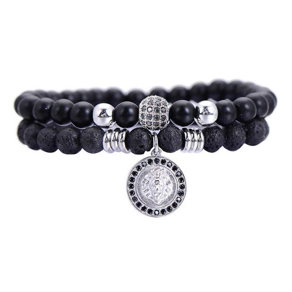 Lisandra Scott Doppelarmband aus Vulkangestein mit Löwenkopf und Natursteinperlen für Herren aus Edelstahl I Armband Verstellbar mit Löwe und Perlen Armbänder Männer Schmuck