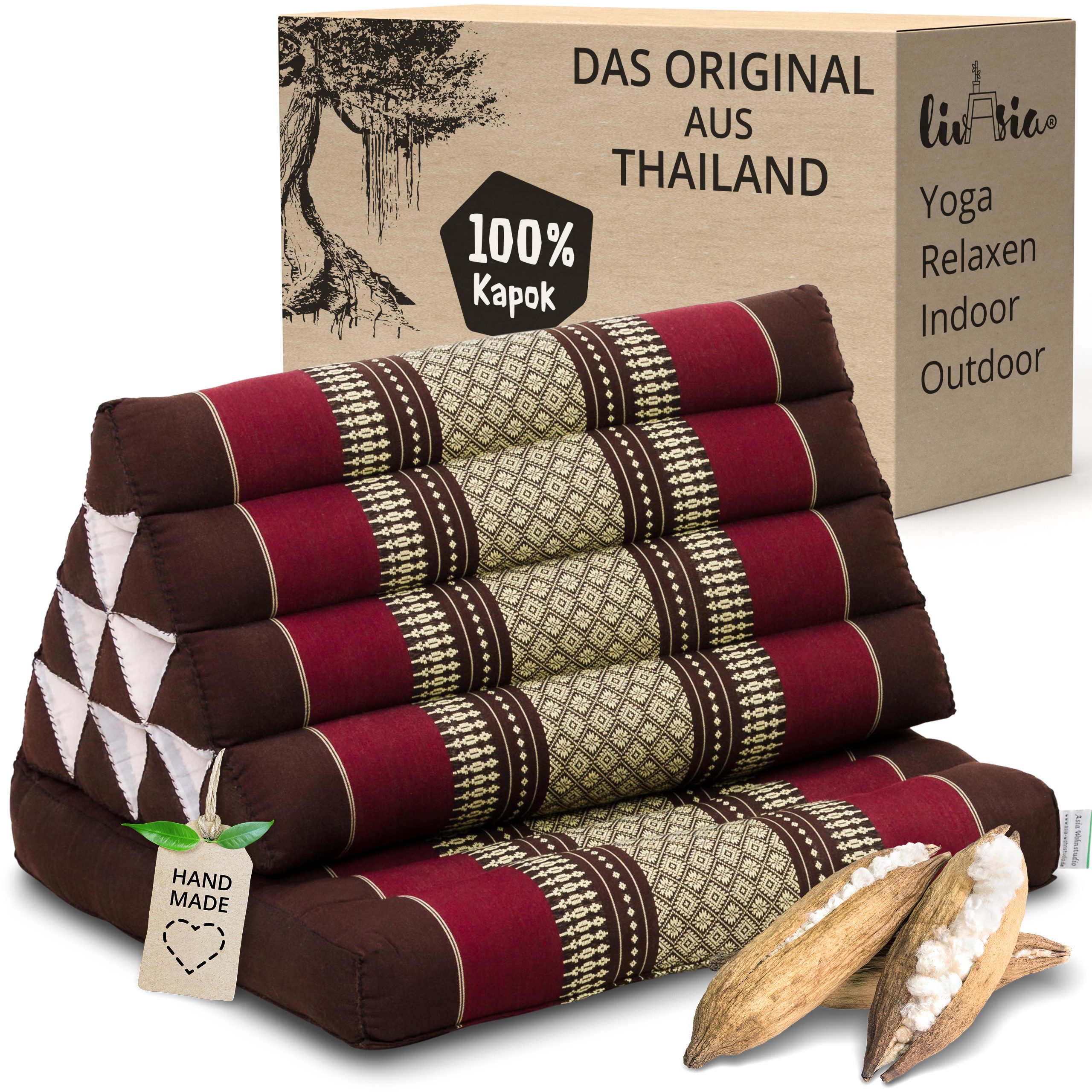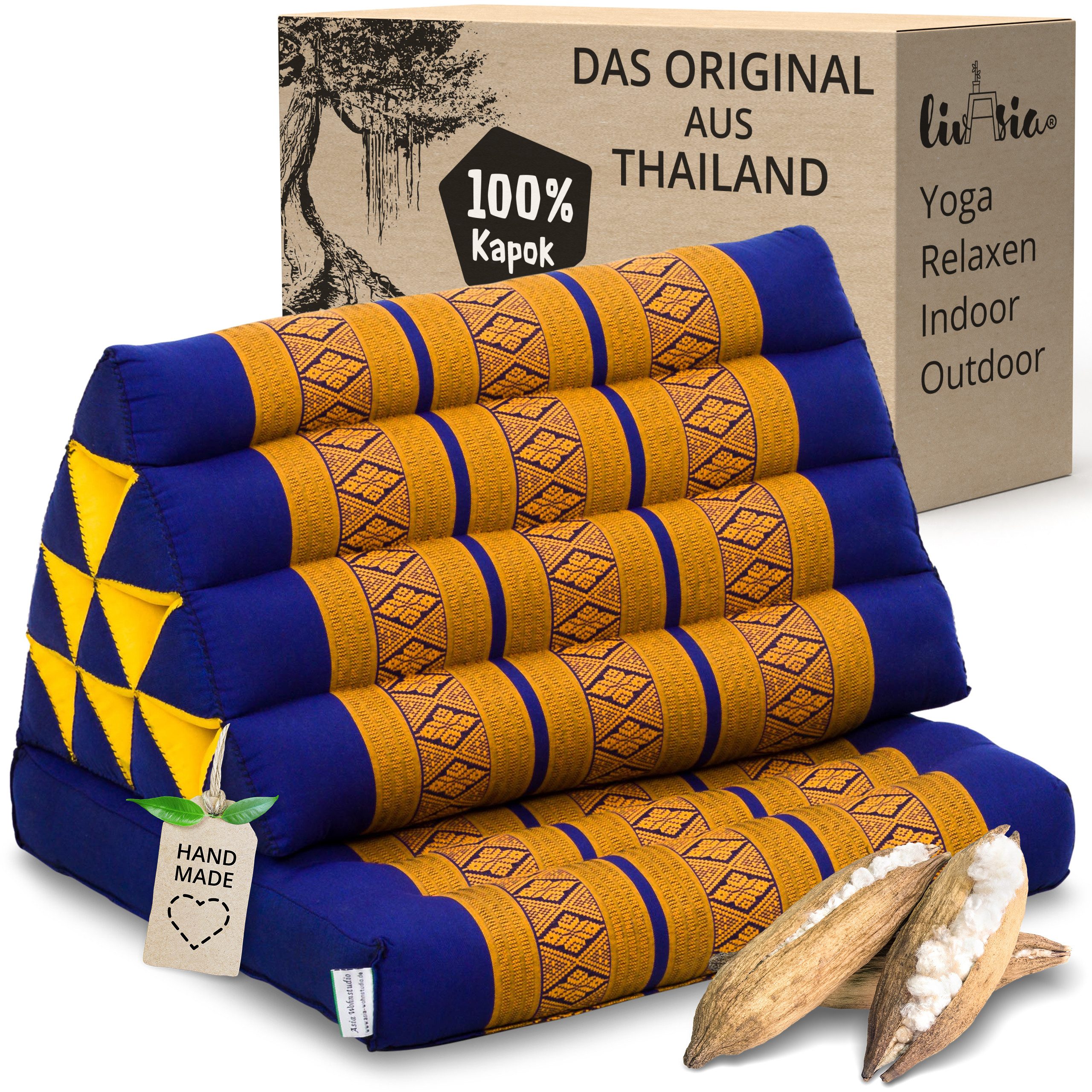 Liebevoll gestaltete Muster im klassischen, fernöstlichen Design dienen als edler Blickfang in jedem Wohnraum. Die handgefertigten Dreieckskissen mit einer Auflage lassen sich leicht zusammenklappen. Die Wunder-Daune Kapok bildet das Herzstück des Kissens. Das formfeste Kissen begeistert durch seine robuste Beschaffenheit. Es begleitet langlebig und unverwüstlich alle Relax-Momente.