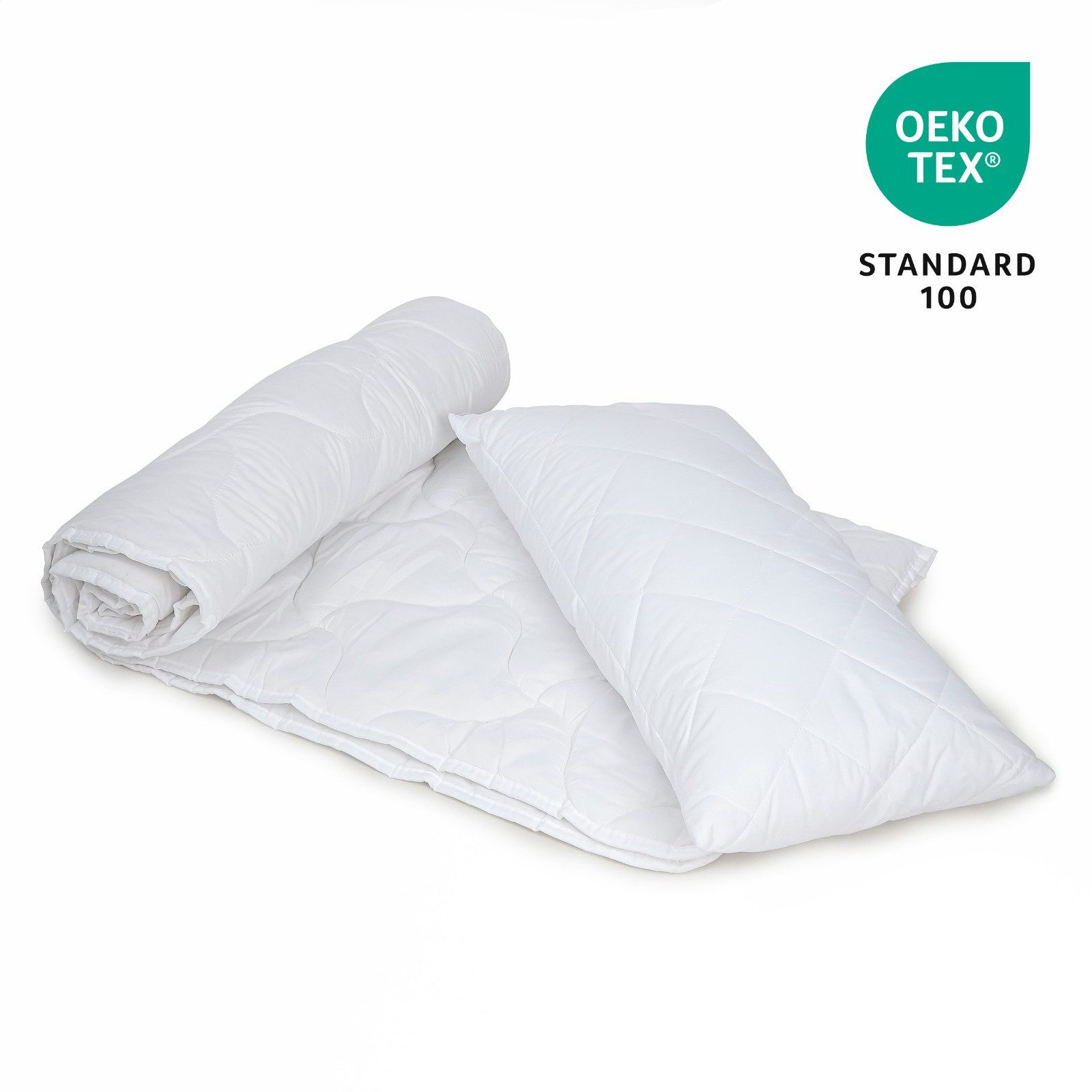 Bettdecke mit Kissen von Livessa BETTDECKE: Livessa Bettdecken sind in 8 Größen erhältlich: Bettdecke 90x120 / 100x135 / 135x200 / 140x200 /155x220 / 200x200 / 200x220 / 240x220 cm Mikrofaser-Bezug: Der Bezug aus hochwertiger Mikrofaser sorgt für ein angenehmes Hautgefühl und ist besonders pflegeleicht. OBERMATERIAL: Mikrofasergewebe INNENMATERIAL: Hohlfaser Hohlfaser-Füllung: Die Füllung mit Hohlfasern bei 300g/m² bietet optimale Wärmeisolierung für das ganze Jahr. 4-Jahreszeiten-Funktion: Die Bettdecken eignen sich dank ihrer Anpassungsfähigkeit für jede Jahreszeit. OEKO-TEX Standard 100: Zertifiziert nach höchsten Standards für umweltfreundliche. Atmungsaktivität: Die Bettdecken regulieren Feuchtigkeit und Temperatur, um ein angenehmes Schlafklima zu gewährleisten. Leicht und angenehm: Durch das geringe Gewicht bieten die Bettdecken höchsten Schlafkomfort ohne unnötige Schwere. Reinigung & Pflegeleicht: Waschbar bis zu 60°C und trocknergeeignet – für einfache und praktische Reinigung. ,Kein Bügeln / Geeignet zum Trocknen bei niedrigen Temperatur / Nicht bleichen Entdecken Sie mit unseren Mikrofaser-Bettdecken eine perfekte Kombination aus Komfort, Funktionalität und Pflegeleichtigkeit für erholsamen Schlaf das ganze Jahr über Gewicht: 90x120 - 0,52 kg , 135x200 - 1,29 kg, 140x200 - 1,34 kg, 155x220 - 1,63 kg, 200x200 - 1,91 kg, 200x220 - 2,1 kg, 220x240 - 2,52 kg KISSEN: Genießen Sie die Vorzüge unserer Mikrofaser mit folgenden Eigenschaften: Sanfte Haptik: Fühlt sich angenehm weich an. Formbeständig: Bewahrt auch nach zahlreichen Waschgängen ihre ursprüngliche Form. Schnell trocknend: Verkürzt die Trockenzeit für eine effiziente Nutzung. Fuselresistent: Bleibt frei von lästigen Fusseln, für dauerhafte Qualität. Atmungsaktiv: Unterstützt ein angenehmes Schlafklima. Faltenfrei: Garantiert eine glatte und gepflegte Optik. Antiallergisch: Besonders zart und sanft, vergleichbar mit der Anmut von Seide. Produktdetails im Überblick: OEKO-TEX Standard 100: Zertifiziert nach höchsten Standards für umweltfreundliche. Material: Bezug: Hochwertige Mikrofaser (100% Polyester) Füllung: Hohlfaser Größe: sind in 9 Größen (+/- 2-3 cm Abweichungen möglich) 40x40 / 40x60 / 40x80 / 40x145 / 50x50 / 50x70 / 60x60 / 65x65 / 80x80 cm Farbe: Weiß Reinigung: Das Kopfkissen ist waschbar, für unkomplizierte Pflege. Lieferung: Die Ware wird in einer Folienverpackung ohne Markenetikett geliefert. Gewicht: 40x60 600g 40x80 600g 50x70 700g 80x80 900g 40x145 900g Erleben Sie mit unserem Mikrofaser-Kopfkissen eine harmonische Verbindung von Luxus, Pflegeleichtigkeit und Schlafkomfort.