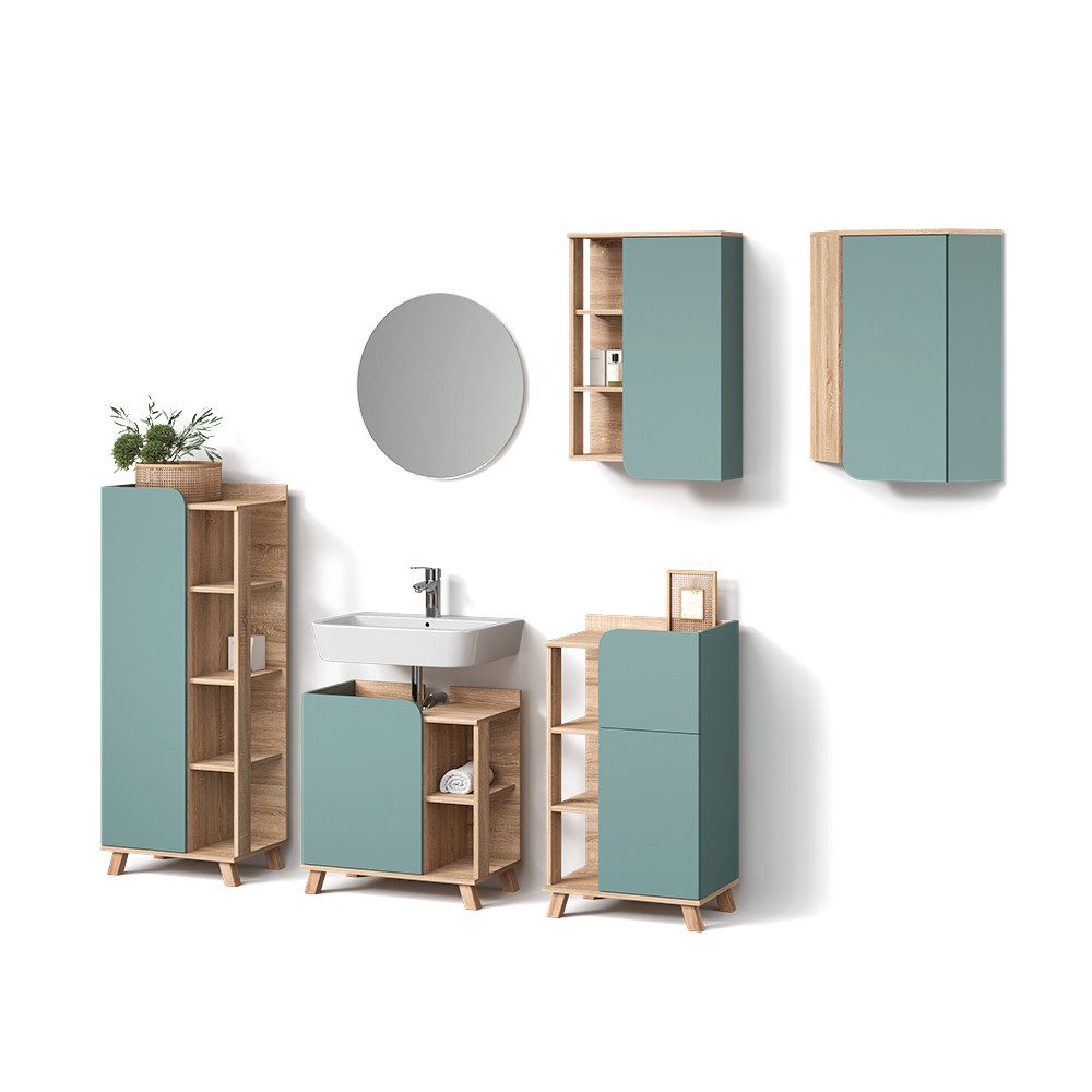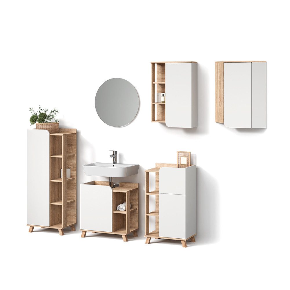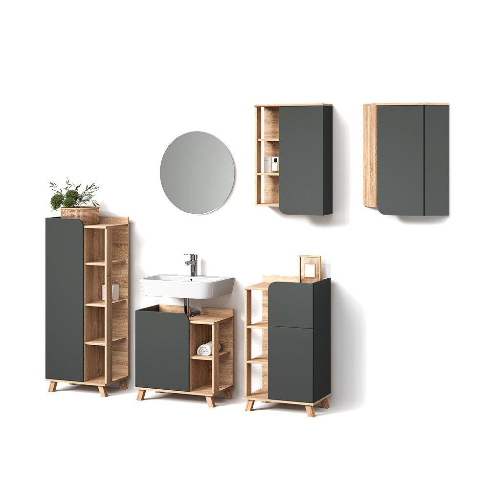 LIEFERUMFANG: Badspiegel, Hängeschrank, Eckhängeschrank, Midischrank, Waschtischunterschrank, Unterschrank (Dekoration nicht im Lieferumfang enthalten), Montageanleitung, Montagematerial#25352