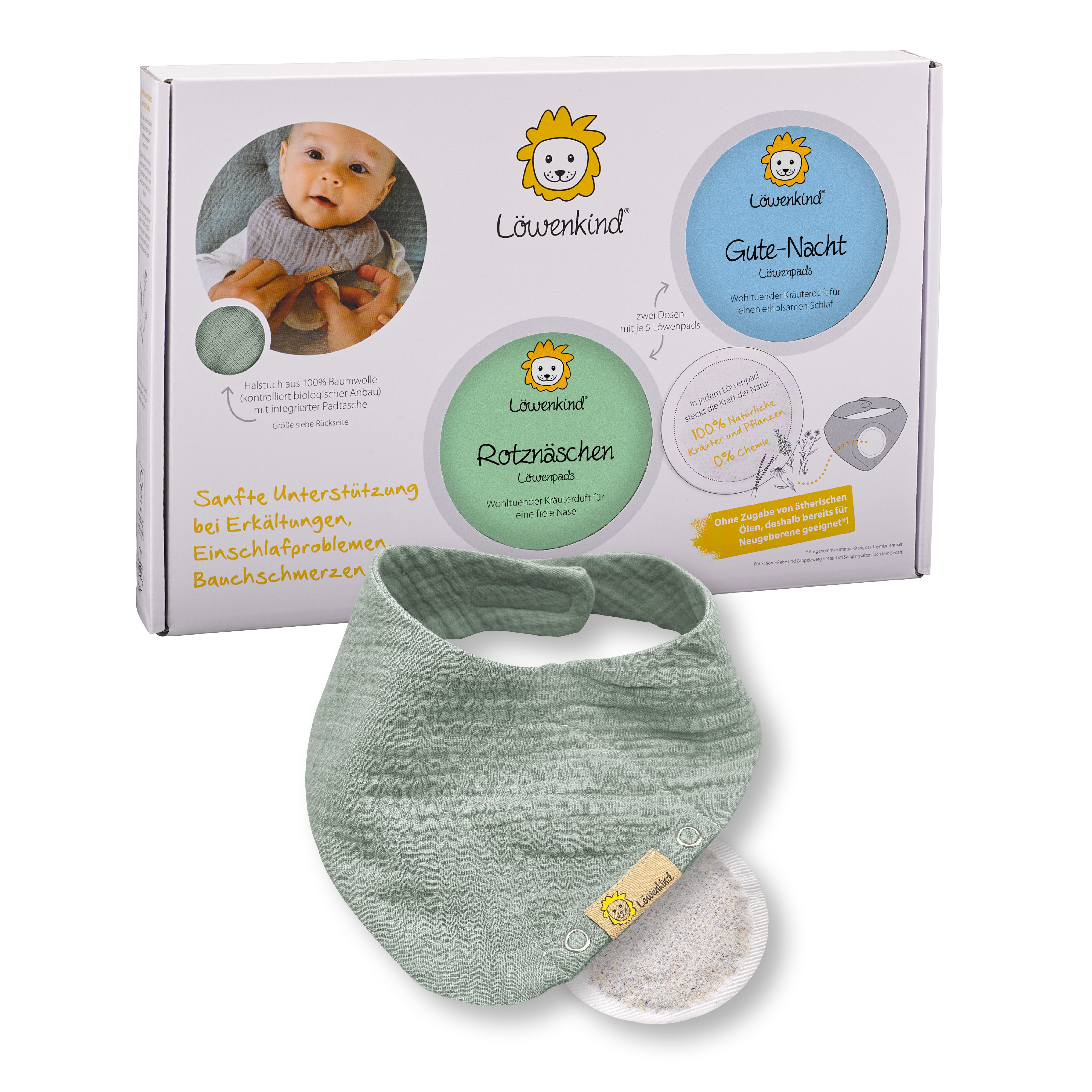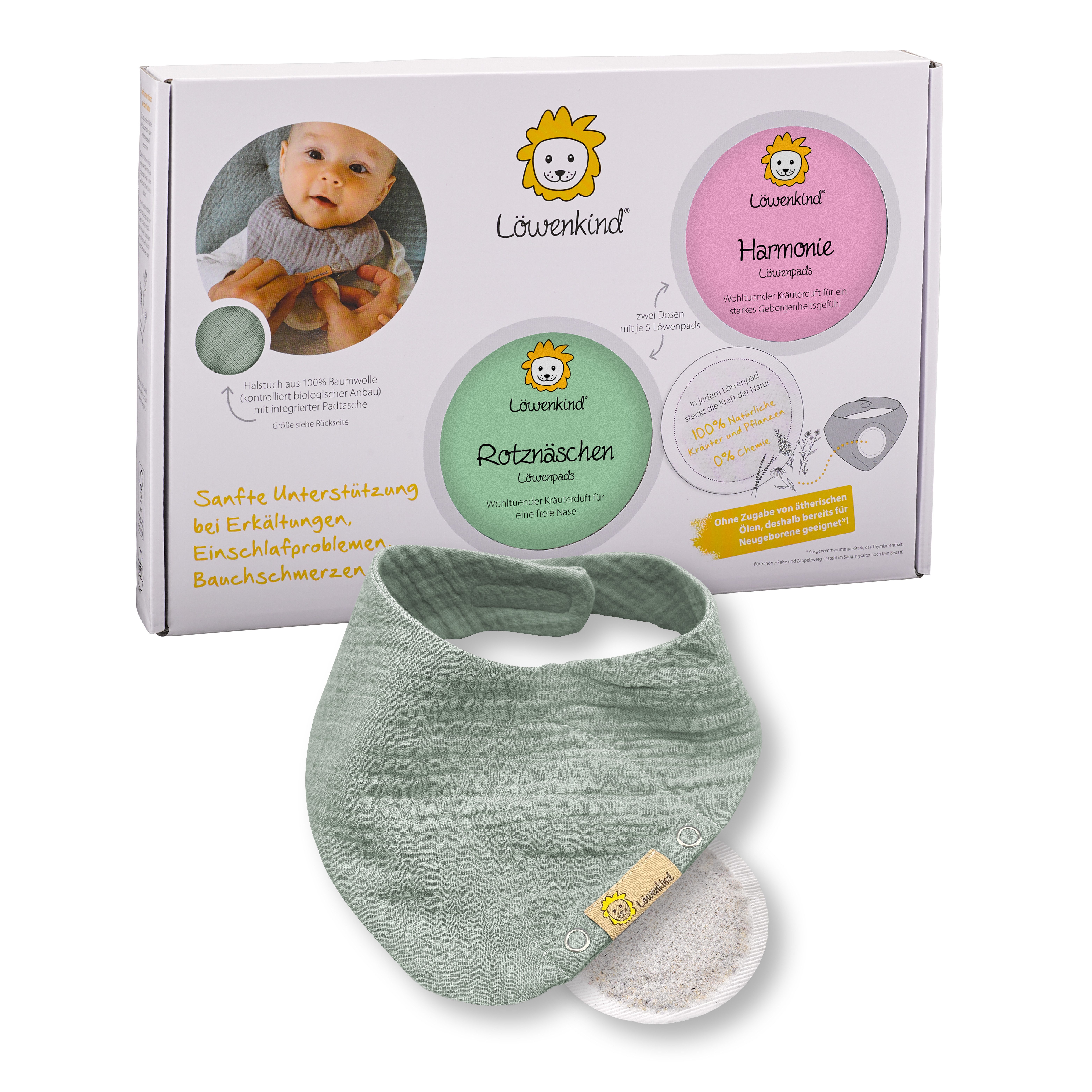 Natürliche Unterstützung bei gängigen Kinder-Wehwehchen. Diese Löwenkind-Einsteigerbox enthält ein Halstuch mit Pad-Tasche in der Размер „Mini“ sowie zwei Kräuterpad-Dosen mit 5 Kräuterpads. Das Rotznäschen-Pad beinhaltet Kamillen-, Schlüsselblumen-, Königskerzenblüten und Rosenblütenblättern. Die fein abgestimmte Kräutermischung unterstützt eine unbeschwerte Atmung und ist ein wohltuender Begleiter in der Erkältungszeit. Im Wonnebäuchlein-Pad sind ausschließlich Melissenblätter, Anis, Kümmel und Fenchel enthalten. Diese Kräuterzusammenstellung streichelt zart den Bauch und lässt ihn sanft ruhen. Das Wonnebäuchlein-Pad stärkt die Verdauung gerade in den ersten Lebensmonaten. Es kann unterstützend eingesetzt werden bei einer Nahrungsumstellung und dem Beikost-Start. Im Gute-Nacht-Pad sind Melissenblättern, Lavendelblüten, Hopfenblüten und Baldrianwurzel enthalten. Diese Kräuter sind beruhigend, schlaffördernd und entspannend. Das Harmonie-Pad besteht nur aus zwei Kräutern: Heublumen und Zirbenflocken als natürlicher Füllstoff. Die wohltuenden Kräuter beruhigen und harmonisieren die Gefühlswelt und stärken das allgemeine Wohlbefinden. Sie erden das empfindliche Wesen, fördern das Geborgenheitsgefühl und stabilisieren bei Unzufriedenheit, Unwohlsein und übermäßigem Weinen. Das Pad eignet sich hervorragend zur Unterstützung während des Zahnens.