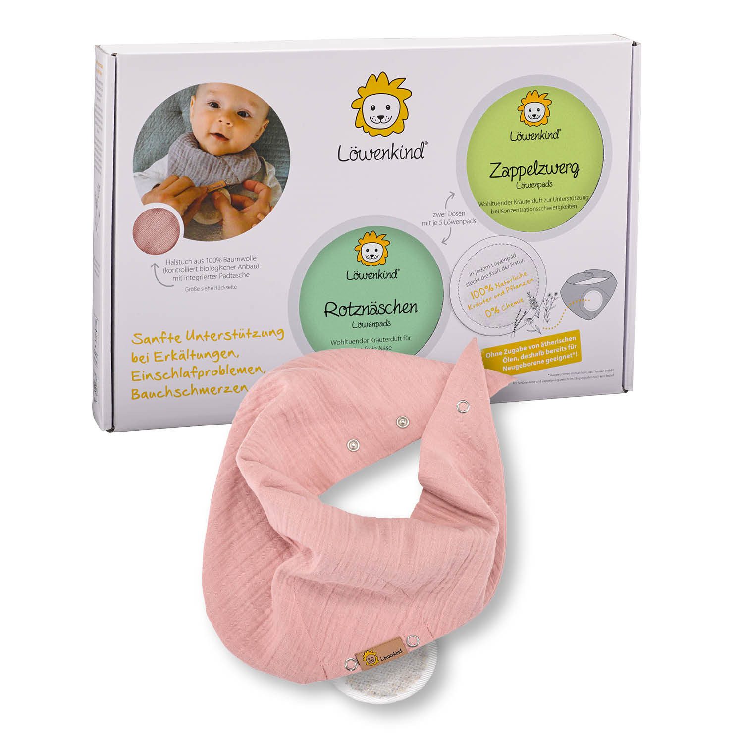 "Natürliche Unterstützung einer freien Nase in der Erkältungszeit und eine gestärkte Konzentration. Diese Löwenkind-Einsteigerbox enthält ein Halstuch mit Pad-Tasche in der Размер „Medi“ sowie je eine Dose mit 5 Pads von Zappelzwerg und Rotznäschen. Dieses Musselin-Halstuch ist für Kinder von 4 bis ca. 12 Jahren geeignet und besteht aus hochwertiger Bio-Baumwolle. Das Rotznäschen-Pad beinhaltet Kamillen-, Schlüsselblumen-, Königskerzenblüten und Rosenblütenblättern. Die fein abgestimmte Kräutermischung fördert eine freie Nase auf natürliche Weise und ist der ideale Begleiter durch die Erkältungszeit. Im Zappelzwerg-Pad sind ausschließlich Melisse, Johanniskraut, Baldrian und Passionsblume und Zirbenflocken als natürlicher Füllstoff enthalten. Diese Kräuterzusammenstellung wirkt beruhigend und entspannend. Das Zappelzwerg-Pad kann auf natürliche Weise zu einer Steigerung der Konzentrationsfähigkeit beitragen und ist bei Kindern ab 3 Jahren anwendbar.