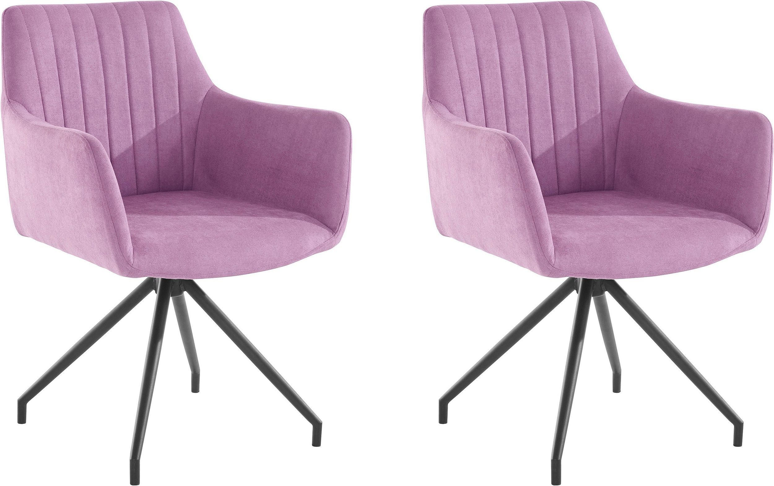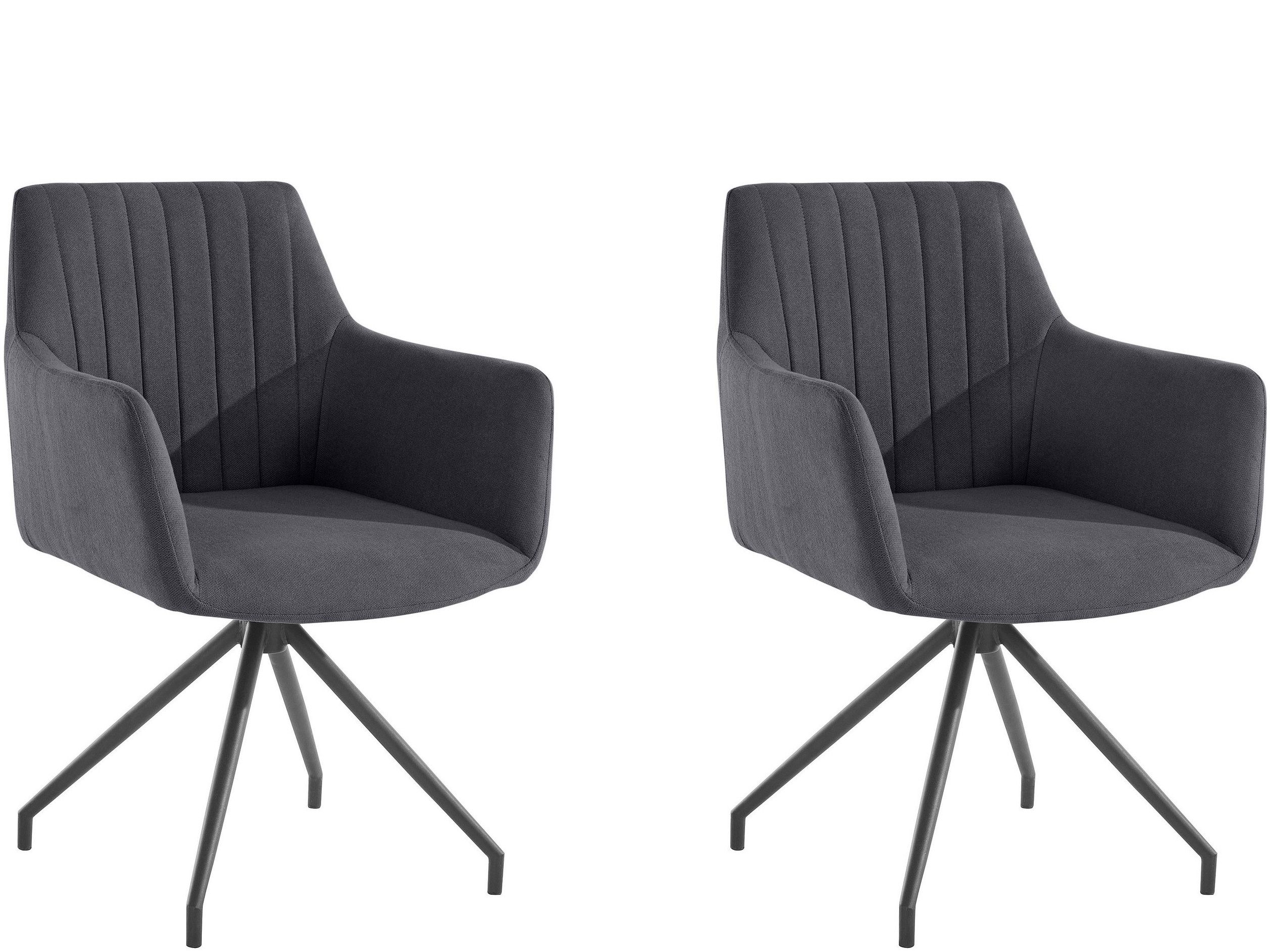 Mit den modernen Esszimmerstühlen »Dagmar« schaffen Sie attraktive Sitzgelegenheiten in Ihrem Zuhause. Die Stühle sind als praktisches 2er-Set erhältlich und punkten optisch mit einem ansprechendem Design und überzeugen durch einen hohen Sitzkomfort. Die Sitzschale ist bequem gepolstert und mit Armlehnen ausgestattet. Der pflegeleichte Bezug aus Webstoff ist strapazierfähig und präsentiert sich mit einer eleganten Steppung. Das 4-Stern-Gestell aus Metall in schwarz bildet einen schönen Kontrast zum Stoffbezug. Ein besonderes Highlight liegt in der Drehfunktion des Stuhls. Dieser lässt sich flexibel um 360° drehen.