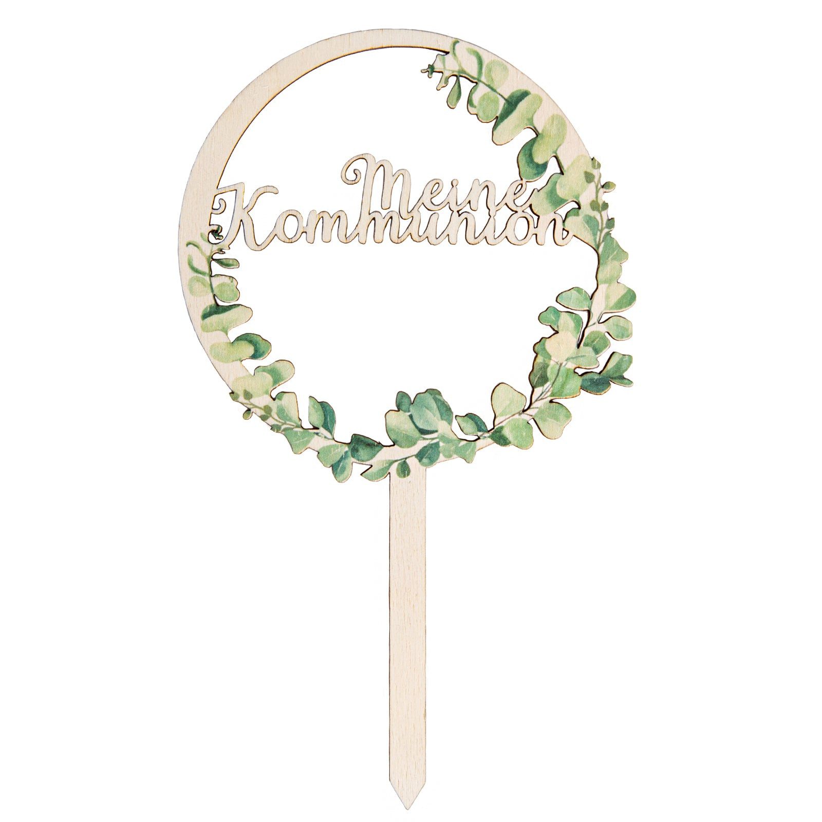 • Wunderschöner Caketopper für eure Torte zur Kommunion. Der Holzstecker mit dem Schriftzug „Meine Kommunion“ ist verziert mit grünen Eukalyptusblättern (bedruckt).