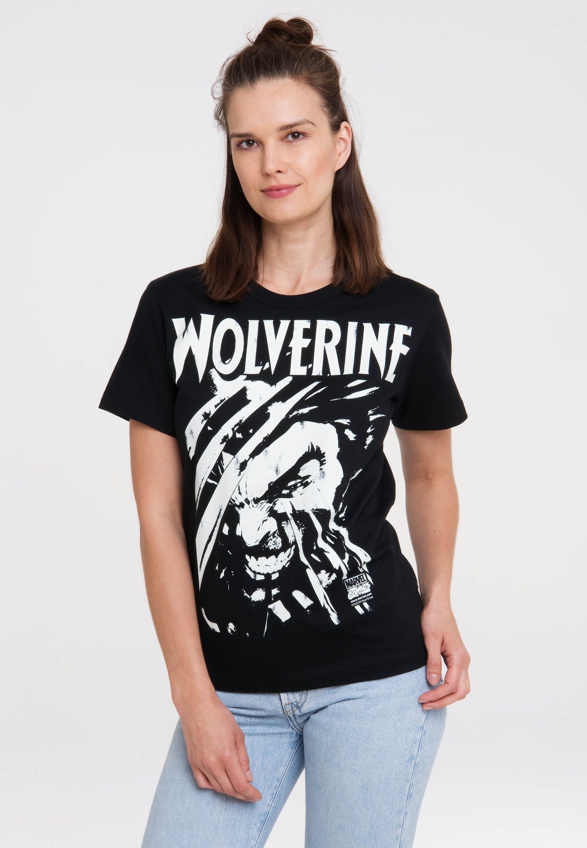 Das bunte Grafik-Shirt "Marvel - Wolverine" von Logoshirt ist mit dem berühmten X-Men Mitglied, Wolverine, bedruckt. Wolverine ist wie alle X-Men ein Mutant, der unter anderem durch seine Stärke und Agilität an ein Tier erinnert. Mit langen Krallen und fletschenden Zähnen beschützt er die Menschen gegen das Böse. Das T-Shirt ist ein echtes "Must Have" für Marvel Comics - X-Men-Fans. Das kurzärmlige Oberteil ist gerade geschnitten und lässt sich sehr gut kombinieren. Wegen des hochwertigen und langlebigen Siebdrucks im Retro-Look wirkt das Grafik-Shirt wie ein Original aus den 60ern und ist ein echter Hingucker. Der speziell erzeugte Aufdruck im Vintage-Stil lässt das Shirt leicht abgenutzt aussehen, beeinträchtigt jedoch keinesfalls die Qualität. Vielmehr wird hiermit der außergewöhnliche Charakter und der hohe Gestaltungsgrad dieses Produktes betont. Aufgrund der Einlaufvorbehandlung bleibt das Easy Fit-Shirt auch nach mehreren Wäschen formstabil. Das T-Shirt mit dem Wolverine Print ist aus 100% hochwertiger Baumwolle hergestellt. Ein T-Shirt, das einfach immer passt! Was will man mehr? Einfach an warmen Sommerabenden mit Shorts kombinieren oder beim Ausflug in die Stadt lässig mit Rock oder Jeans tragen. So ist schnell und einfach für jede Gelegenheit das richtige Outfit gefunden. Logoshirt steht für lizenziertes und authentisches Originaldesign.