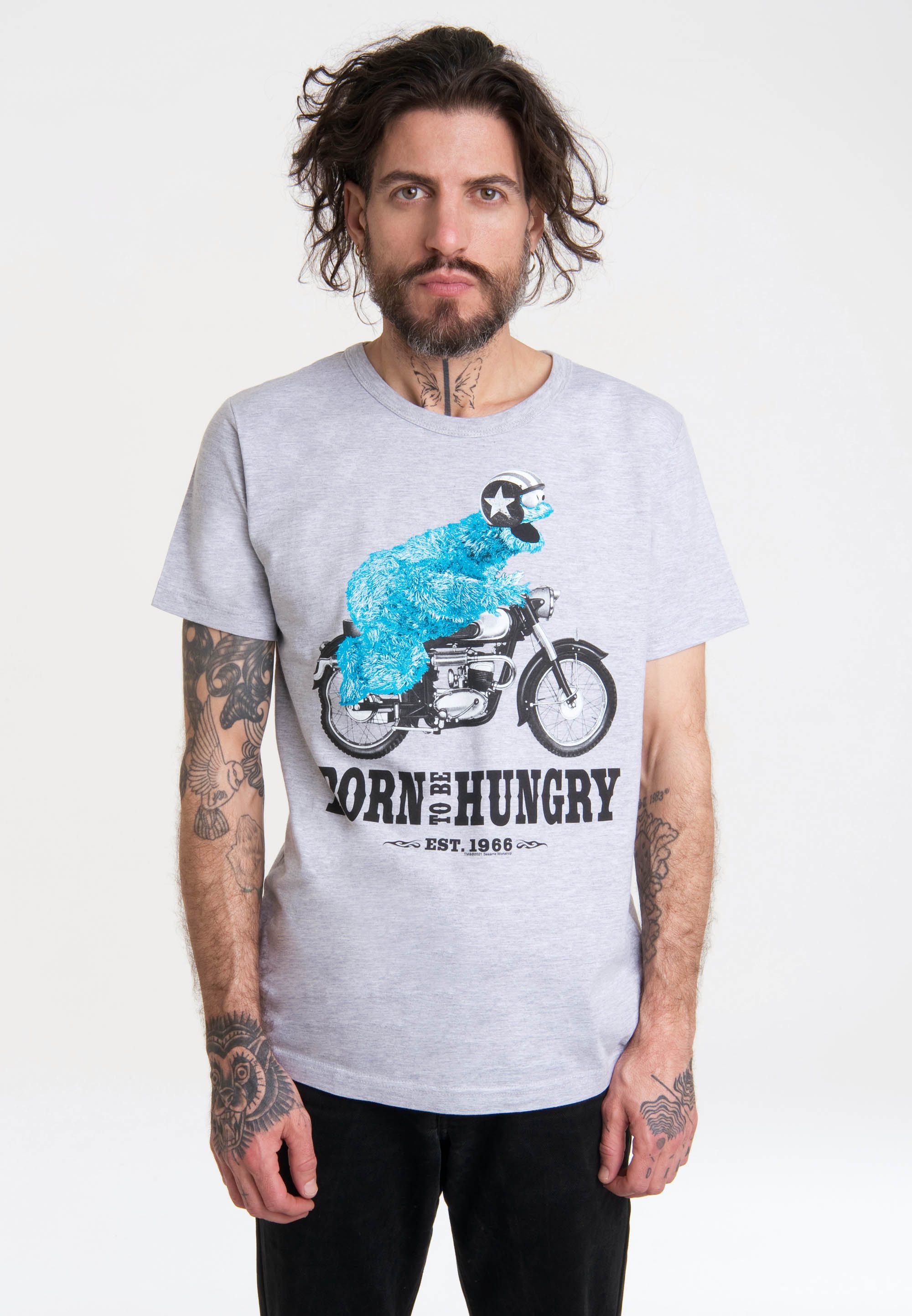 Das bunte Grafik T-Shirt Cookie Monster - Born To Be Hungry von Logoshirt ist mit dem weltberühmten, dauerhungrigen Held aus der Sesamstrasse, dem Krümelmonster, bedruckt. Das große Monster mit dem blauen Zotteln und den rollenden Augen liebt Kekse über alles. Das T-Shirt ist ein echtes Must-Have für Sesamstrassen-Fans. Das kurzärmlige Oberteil ist gerade geschnitten und lässt sich sehr gut kombinieren. Wegen des hochwertigen und langlebigen Siebdrucks im Retro-Look wirkt das Grafik T-Shirt wie ein Original aus den 60ern und ist ein echter Hingucker. Aufgrund der Einlaufvorbehandlung und seiner hervorragenden Qualität bleibt das Shirt auch nach mehreren Wäschen formstabil. Ein T-Shirt, das einfach immer passt! Was will man mehr? Einfach an warmen Sommerabenden mit Shorts kombinieren oder beim Ausflug in die Stadt lässig mit Chino oder Jeans tragen. So ist schnell und einfach für jede Gelegenheit das richtige Outfit gefunden. Logoshirt steht für lizenziertes und authentisches Originaldesign.