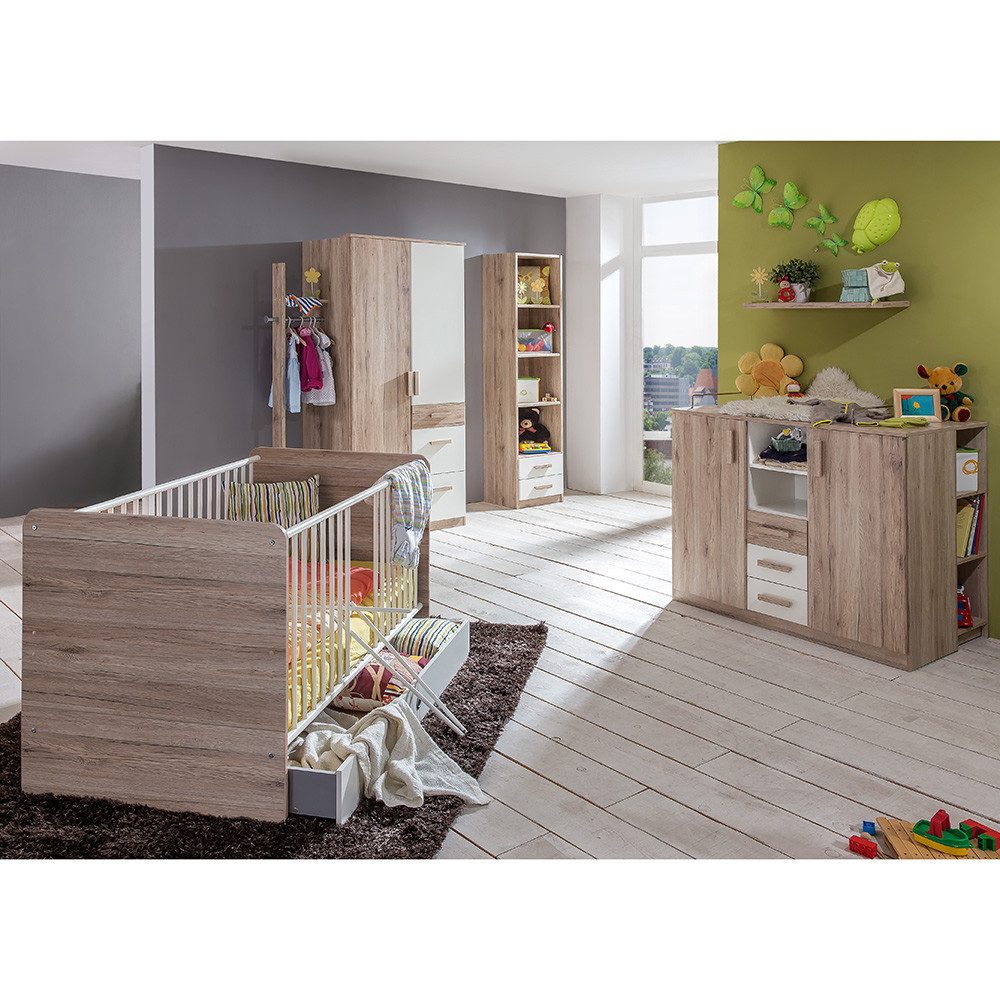 Gestalte ein liebevolles und funktionales Babyzimmer mit diesem durchdachten Möbel-Set in Eiche Nachbildung mit Weiß! Das Set umfasst eine Wickelkommode, einen geräumigen Kleiderschrank, ein Regal, ein Wandboard und ein wandelbares Gitterbett, das sich später zum Juniorbett umbauen lässt. Perfekt für wachsende Bedürfnisse – hier trifft praktischer Stauraum auf stilvolles Design.