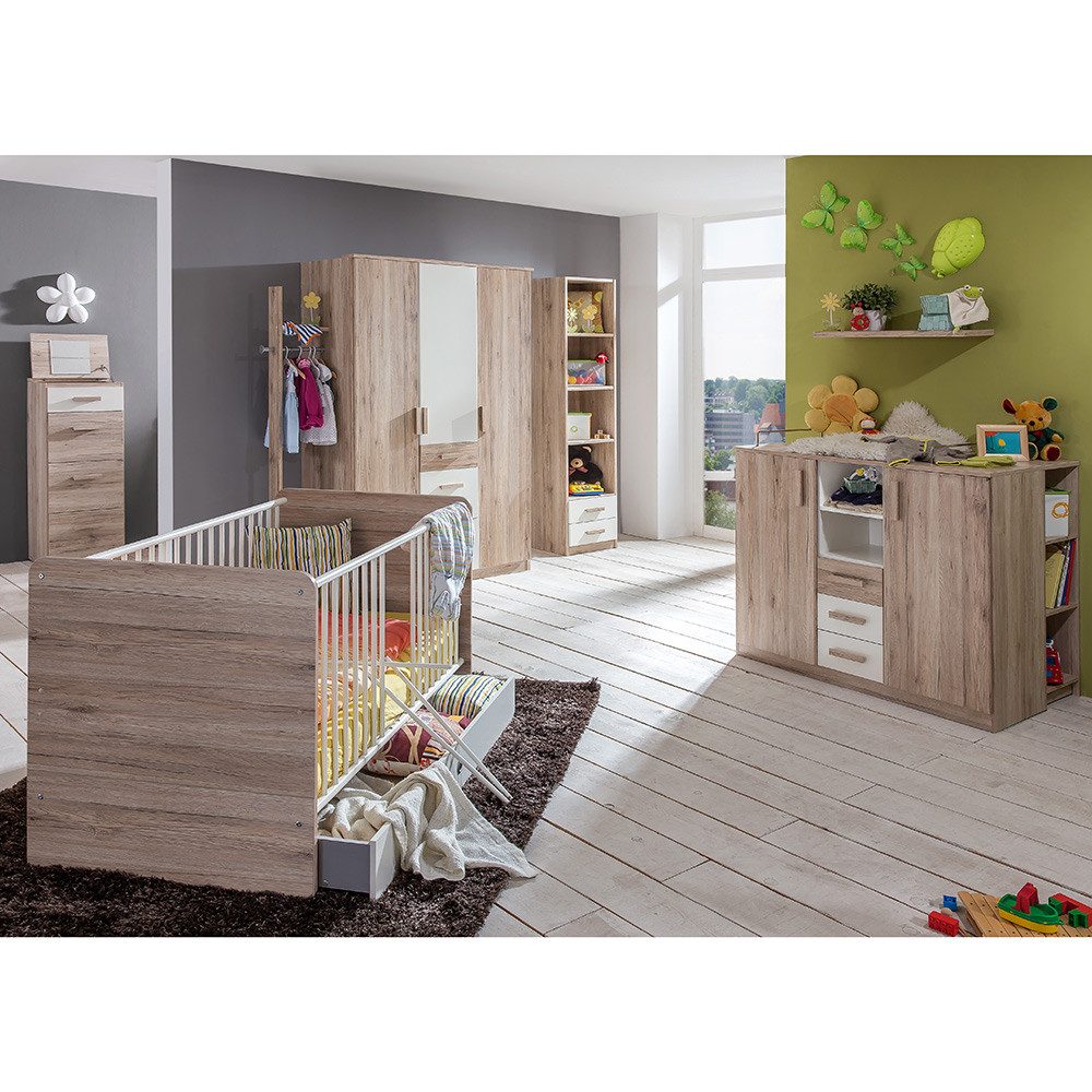 Gestalte ein liebevolles und funktionales Babyzimmer mit diesem durchdachten Möbel-Set in Eiche Nachbildung mit Weiß! Das Set umfasst eine Wickelkommode, einen geräumigen Kleiderschrank, ein Regal, eine Hochkommode, ein Wandboard und ein wandelbares Gitterbett, das sich später zum Juniorbett umbauen lässt. Perfekt für wachsende Bedürfnisse – hier trifft praktischer Stauraum auf stilvolles Design.