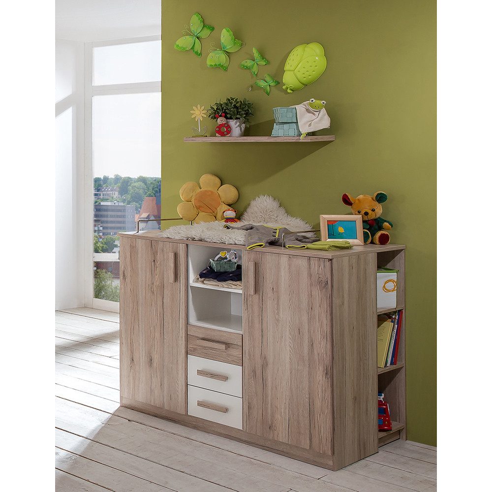 Dieses liebevoll gestaltete Babyzimmer-Set bietet dir die perfekte Kombination aus Funktionalität und Stil. Die Wickelkommode mit praktischem Wickelaufsatz und Schubkästen sorgt für maximalen Stauraum, während das Wandboard zusätzlichen Platz für Pflegeprodukte oder Dekoartikel schafft. Die Kombination aus Eiche Nachbildung und Weiß verleiht dem Raum eine warme, moderne Optik. Eine ideale Lösung für Eltern, die Wert auf Ordnung und Design legen.