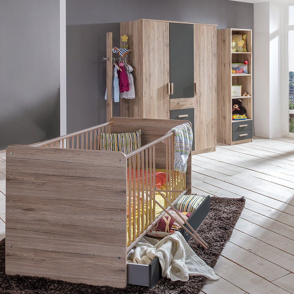 Gestalte ein modernes und funktionales Babyzimmer mit diesem stilvollen Möbel-Set in Eiche-Nachbildung mit Graphit-Elementen! Das Set umfasst ein wandelbares Gitterbett mit höhenverstellbarem Lattenrost und Bettschubkasten, einen geräumigen Kleiderschrank und ein praktisches Standregal. Durch hochwertige Materialien und durchdachtes Design bietet das Set optimalen Stauraum und wächst mit deinem Kind mit.