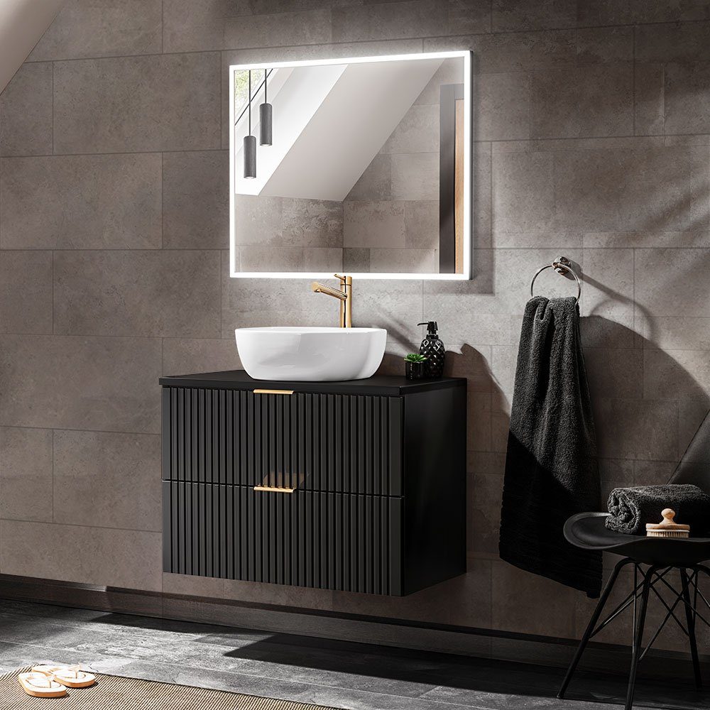 Unsere Badmöbel-Serie ADELAIDE-56-BLACK vereint modernes Design mit Eleganz. Matt schwarze Möbel, ergänzt mit goldfarbenen, chromfarbenen oder schwarzen Griffen macht aus jedem Badezimmer einen Wohlfühlort.