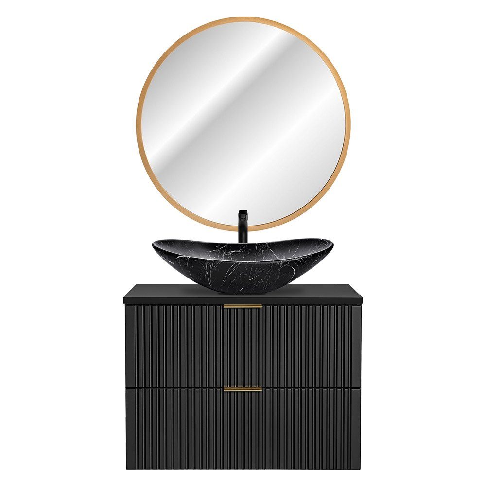Unsere Badmöbel-Serie ADELAIDE-56-BLACK vereint modernes Design mit Eleganz. Matt schwarze Möbel, ergänzt mit goldfarbenen, chromfarbenen oder schwarzen Griffen macht aus jedem Badezimmer einen Wohlfühlort.