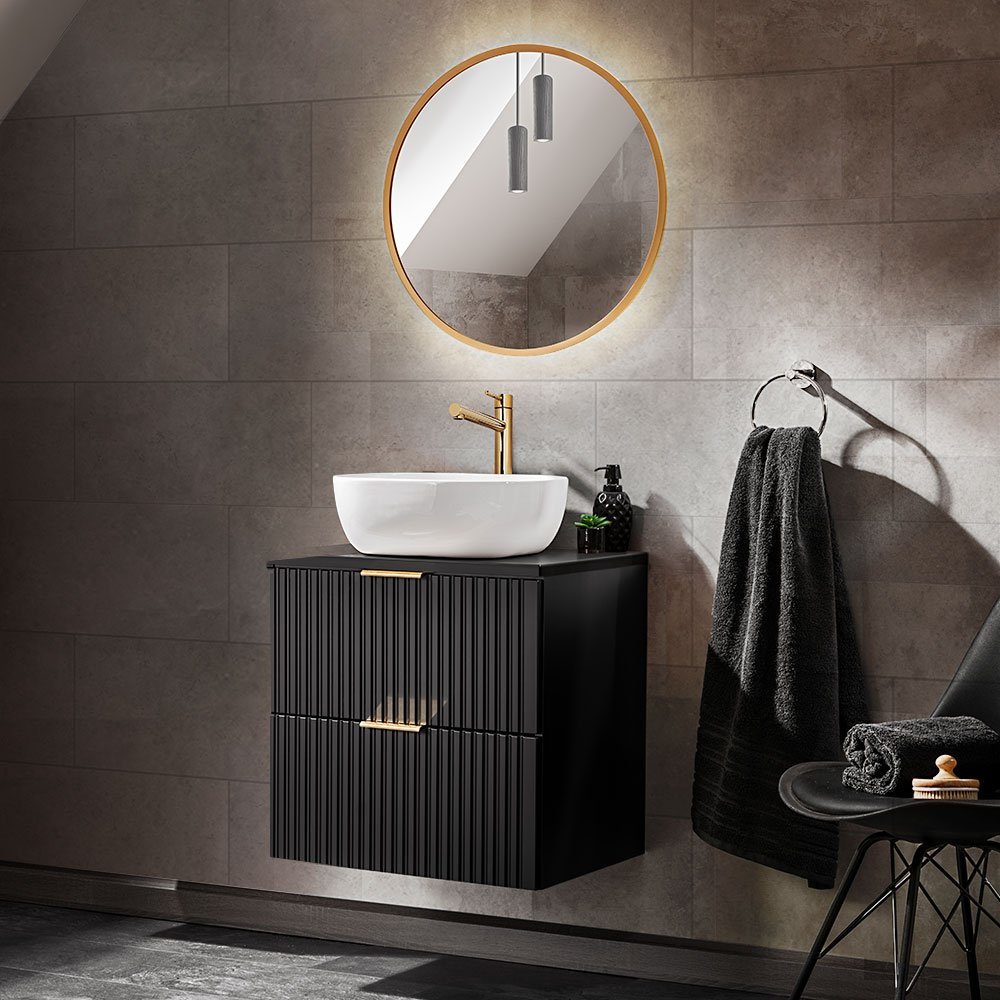 Unsere Badmöbel-Serie ADELAIDE-56-BLACK vereint modernes Design mit Eleganz. Matt schwarze Möbel, ergänzt mit goldfarbenen, chromfarbenen oder schwarzen Griffen macht aus jedem Badezimmer einen Wohlfühlort.
