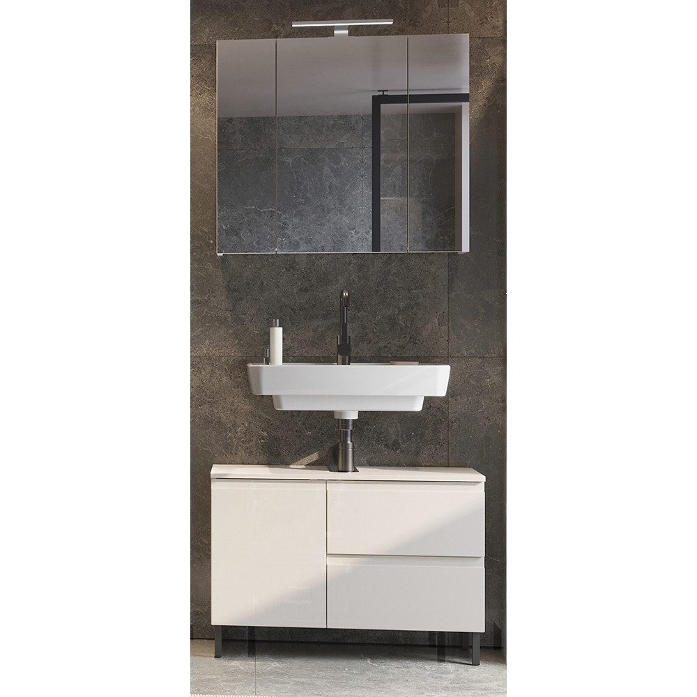 Modern, hochwertig und funktional – dieses Waschplatz-Set in elegantem Kaschmir mit matter Front verleiht deinem Bad einen stilvollen Look. Der 80 cm breite Waschbeckenunterschrank bietet reichlich Stauraum für alles, was du täglich brauchst. Praktisch: Selbsteinzug und Türdämpfung sorgen für leises Спрятать. Schwarze Metallfüße und Griffmulden unterstreichen das moderne Design. Der Spiegelschrank mit LED-Aufsatzleuchte, Schalter-Steckdosen-Kombi und Glaseinlegeböden macht deine Pflegeroutine komfortabel und stilvoll. Hochwertige ABS-Kanten und feuchtigkeitsresistente Oberflächen stehen für Qualität und Langlebigkeit.
