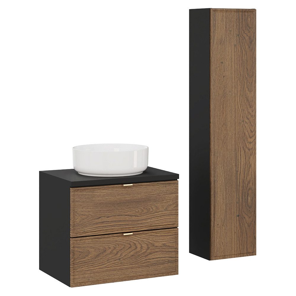 Der 60 cm breite Waschtisch mit elegantem weißen Keramik-Aufsatzwaschbecken sorgt für einen hochwertigen Look. Zwei geräumige Schubladen mit Softclose-Technologie bieten cleveren Stauraum. Der Hochschrank mit flexibel montierbarer Tür und verstellbaren Einlegeböden schafft zusätzlichen Platz für Pflegeprodukte und Handtücher. Drei Griff-Sets in Gold, Chrom und Schwarz ermöglichen eine individuelle Gestaltung.