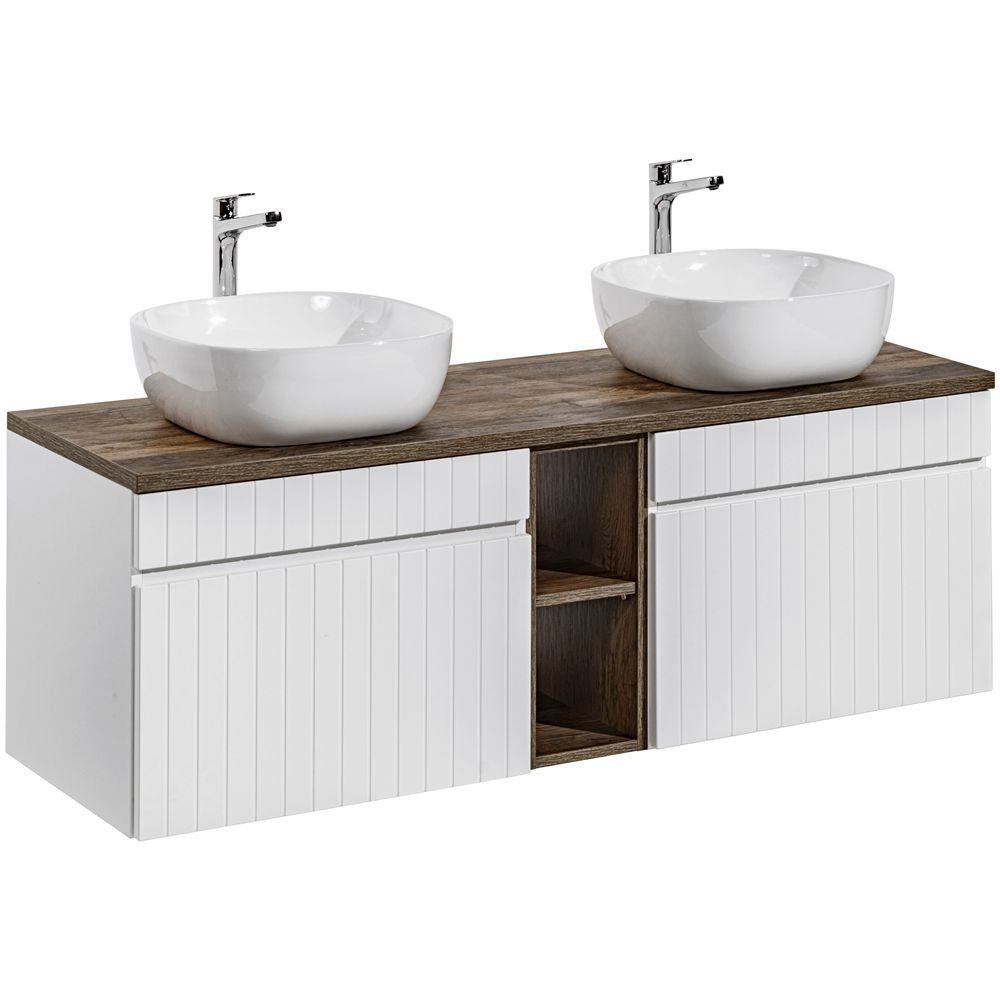 Die Badmöbel Kollektion IRAKLIO-56 vereint zeitlos weiße Eleganz mit warmen Holzakzenten. Die aufwändig gearbeiteten Fronten in Rillenoptik wirken sehr modern und verleihen den Badmöbeln zugleich einen besonders individuellen Look. Integrierte Türdämpfung, komfortables Softclose-System bei den Auszügen, sowie die hochwertigen MDF-Fronten, machen diese Badmöbelserie besonders attraktiv. Durch die unterschiedlichen Spiegel, Waschbecken, Abdeckplatten und Regale, ergeben sich unzählige Kombinationsmöglichkeiten und Stile.