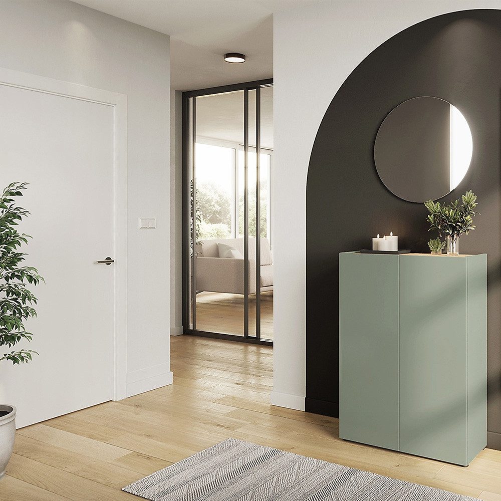 Dieses 2-teilige Garderoben Set in grün mit warmer Eiche überzeugt mit seinem modernen, klaren Design und bietet dir gleichzeitig praktischen Stauraum. Der grifflose Hochschrank hält Schuhe, Taschen oder Alltagsgegenstände dezent verborgen und sorgt für Ordnung. Der runde Spiegel ergänzt das Set perfekt und bringt Leichtigkeit in den Raum. Eine Kombination, die zeitlos wirkt und in jedem Eingangsbereich, Flur oder Schlafzimmer eine tolle Figur macht.
