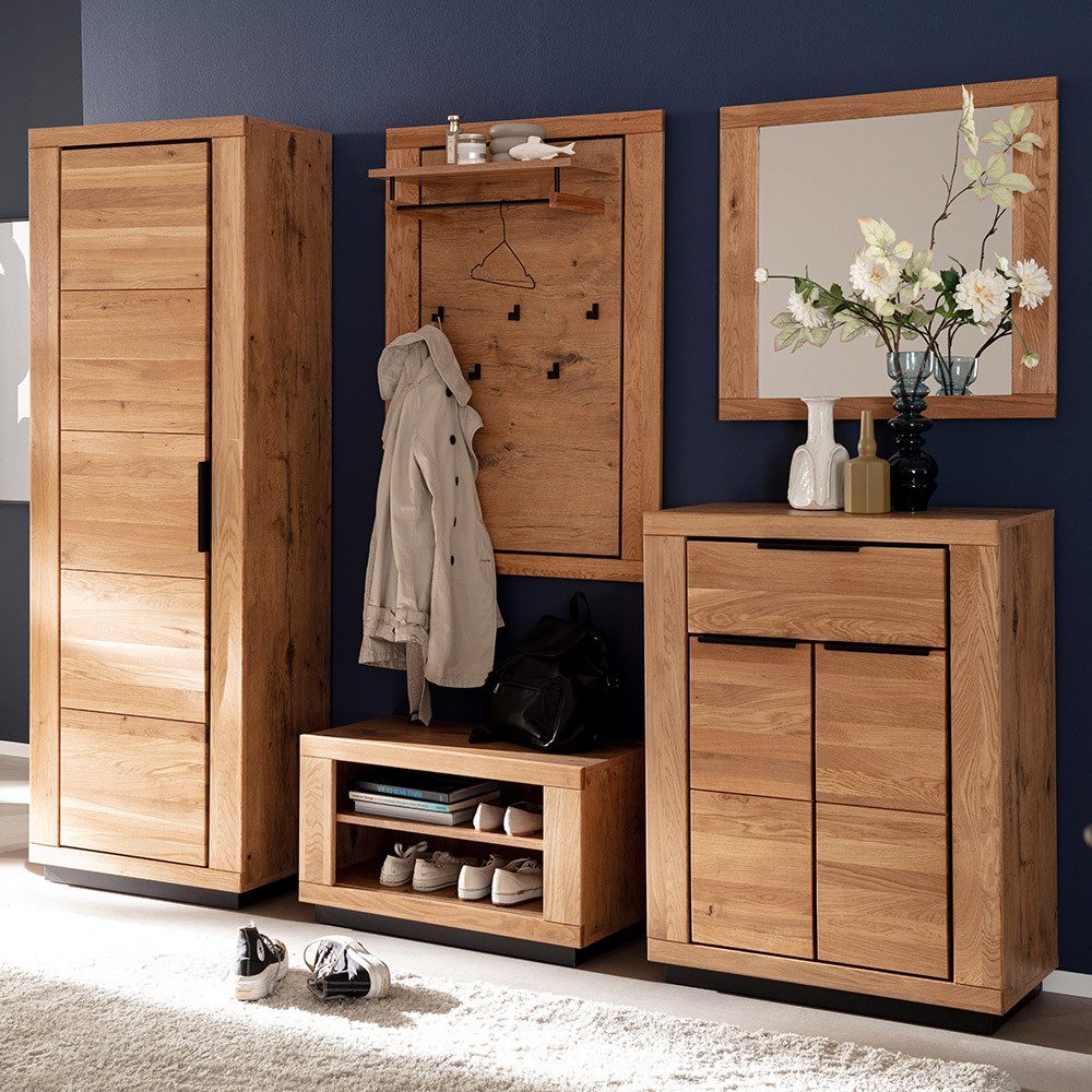 Fronten in massiver Wildeiche geölt und Korpus in passender Nachbildung schaffen eine einladende Atmosphäre. Mit Bank, Schrank, Kommode, Paneel und Spiegel bietet es Platz für Schuhe, Jacken, Accessoires und deinen letzten Outfit-Check. Schwarze Griffe, Haken und Stange setzen markante Akzente.