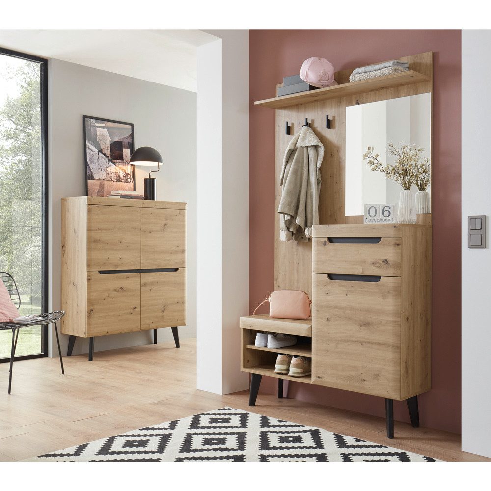 Mit den Garderobenmöbeln TIROL-61 im skandinavischen Design zieht sofort Gemütlichkeit in deinen Eingangsbereich ein. Die 3D-Touchwood Oberfläche in Artisan Eiche Nb. verleiht sofort ein Wohlfühlatmosphäre - direkt beim Heimkommen. Mit weiteren Einzelmöbeln kannst du dir deinen Eingangsbereich perfekt gestalten oder einen unserer Kombinationsvorschläge auswählen. Die Sideboards, Lowboards und Regale können beliebig kombiniert werden.