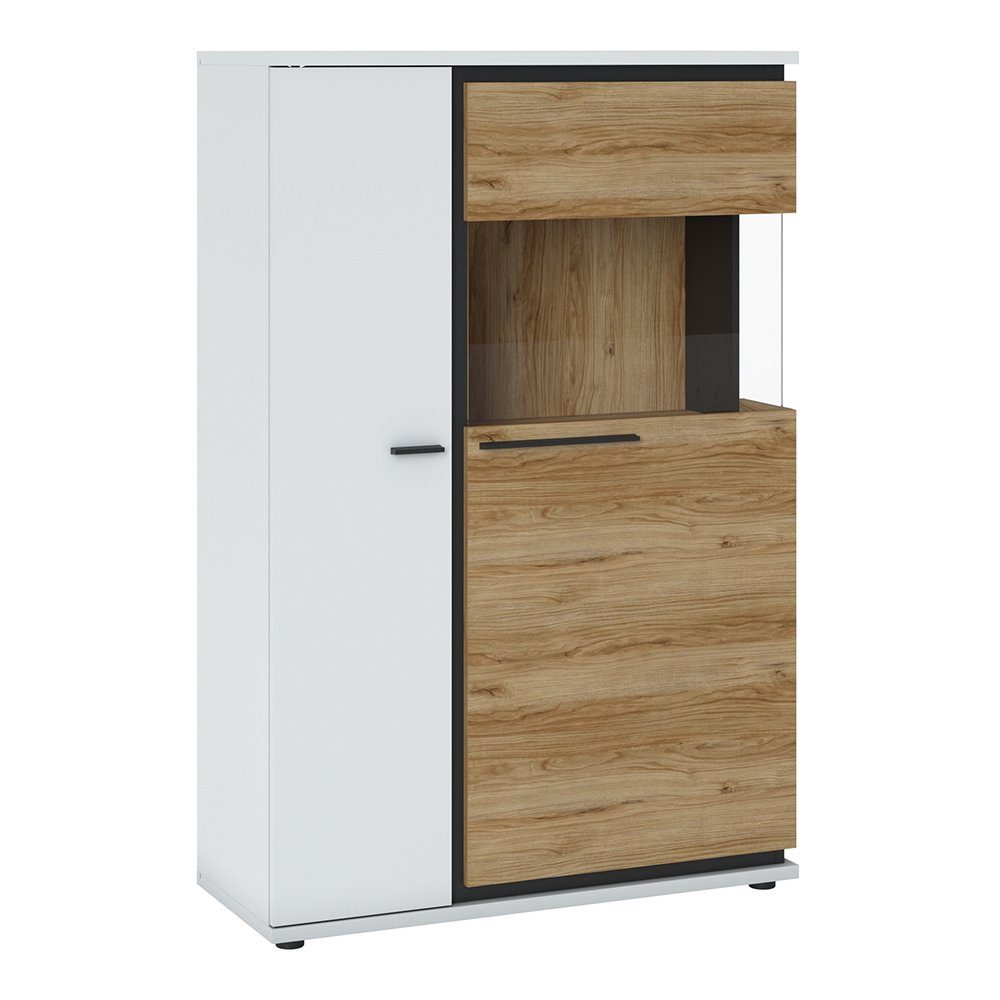 Die Möbelserie SANDVIKA-129 ist die perfekte Wahl für alle, die stilvolle Möbel suchen. Die Serie besticht durch ihre elegante Optik in Alpinweiß und dem ansprechenden Catania Eiche Nb. Dekor welches durch die Absetzungen in schwarz matt zusätzlich veredelt wird. Die Kombination aus diesen beiden Farben verleiht der Serie ein modernes und zeitloses Design.