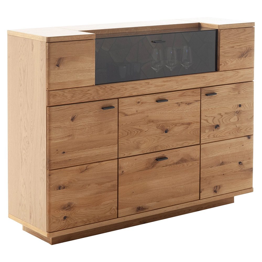 Die massiven Eichenfronten mit geölter Oberfläche strahlen Wärme aus, während das Glaselement mit Scheitholzoptik dahinter einen faszinierenden Blickfang bildet. Türen, Klappe und Schubladen mit Softclose schenken dir Komfort bei jeder Nutzung. Ob als Stauraumwunder oder als dekoratives Statement – dieses Highboard bereichert dein Zuhause spürbar.
