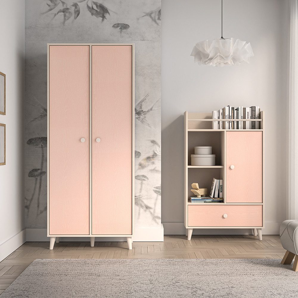 Dieses 2-teilige Set bringt praktische Ordnung und sanftes Design ins Kinderzimmer. Der zweitürige Kleiderschrank bietet mit Kleiderstangen und Einlegeböden großzügigen Stauraum für Kleidung und Accessoires. Das Regal ergänzt den Stauraum mit offenen Fächern, einer Tür und einer geräumigen Schublade – ideal für Bücher, Deko oder Spielsachen. Die fühlbare Holzstruktur, rosa Fronten, Softclose-Funktion und ABS-Kanten sorgen für Sicherheit, Langlebigkeit und ein freundliches Ambiente im modernen Skandi-Stil.
