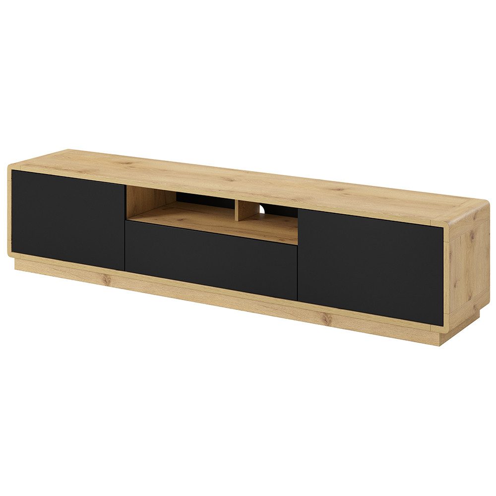 Das Lowboard bietet ausreichen Platz für einen großen Fernseher. Впередe Geräte können in dem offenen Fach positioniert werden. Türen und Schubkasten bieten weiteren Stauraum für Konsolen, Spiele oder Filme.