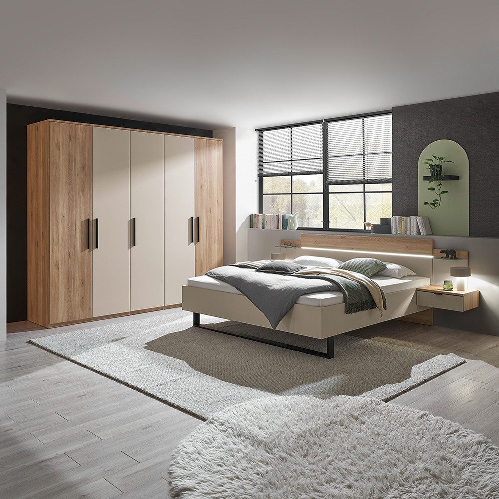 Natürlich, modern und funktional – dieses 2-teilige Schlafzimmer-Set bringt Ruhe und Stil in deinen Raum. Die Bettanlage mit Beleuchtung, Glasablagen und schwebenden Nachtkonsolen bietet Komfort und klare Linien. Der passende Kleiderschrank mit 5 Türen überzeugt durch Softclose, schwarze Griffe und flexible Stauraumlösungen. Mauvella Oak trifft auf Kaschmir – ein harmonischer Mix aus warmem Holzton und ruhiger Eleganz. Perfekt für alle, die ein Schlafzimmer wollen, das nicht nur gut aussieht, sondern sich auch gut anfühlt.