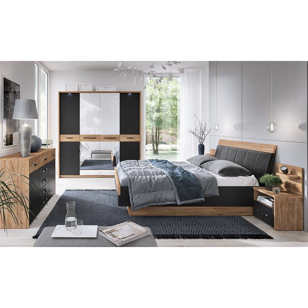 Mit schwarzen Metallgriffen und einem Mix aus Eiche Nachbildung und mattem Schwarz schafft diese Serie eine zeitgemäße Ästhetik. Der Kleiderschrank, inklusive Beleuchtung im Kranzboden, setzt nicht nur deine Kleidung ins rechte Licht, sondern auch den Raum.