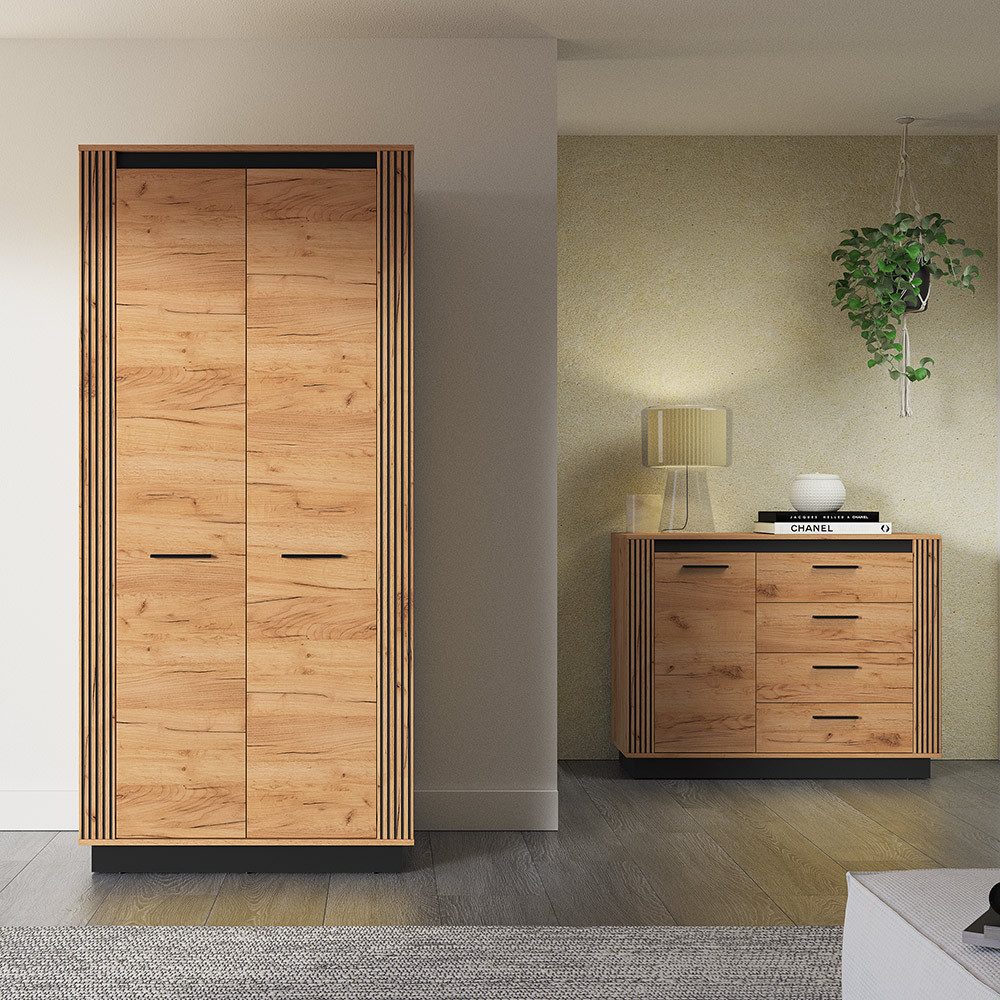 Der schöne Eichefarbton kombiniert mit edlen schwarzen Details verleiht deinem Raum eine moderne Optik und gleichzeitig höchste Funktionalität. Die vertieften schwarzen Rillen setzen stilvolle Kontraste und verleihen dem Möbelstück eine raffinierte Tiefe.
