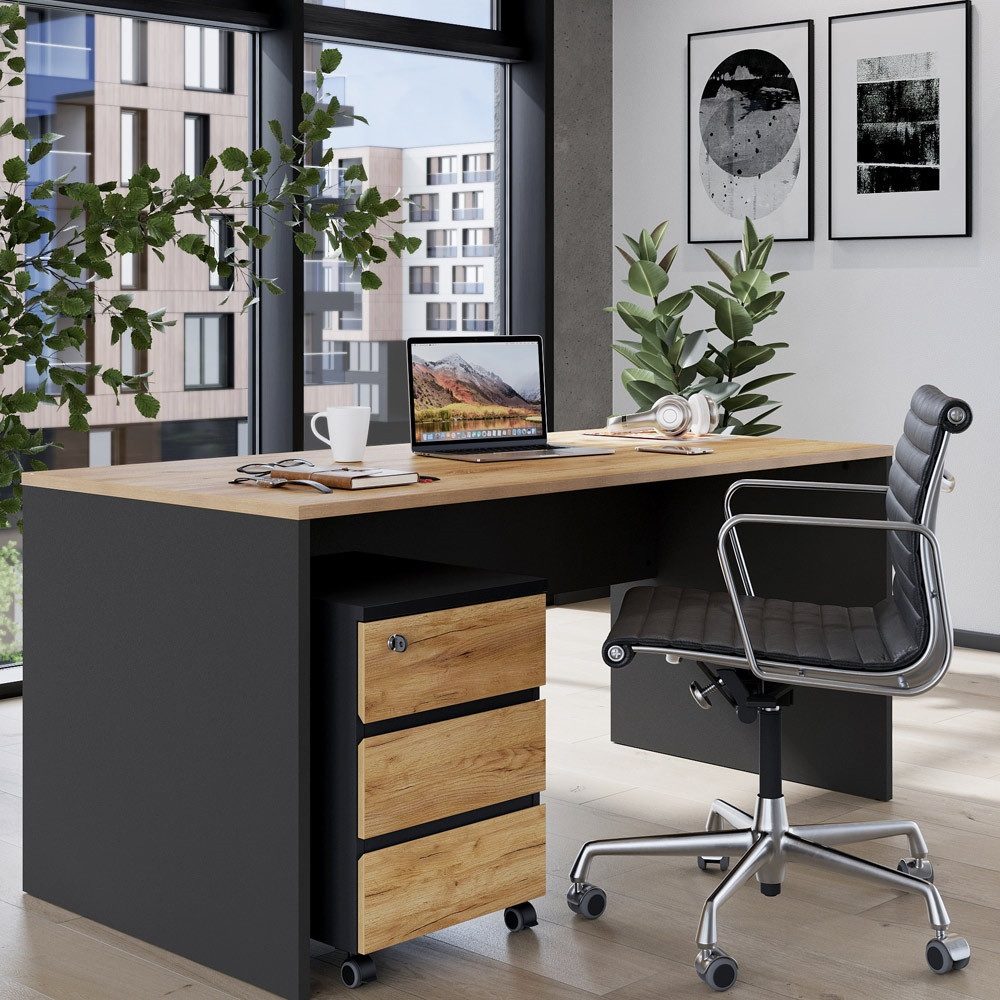 Ob für das Geschäftsbüro oder dein Home Office - mit der Serie LUGANO-01 schaffst du ein angenehmes Arbeitsumfeld. Die Büromöbel Made in Germany punkten nicht nur durch ihre Optik in der topmodernen Farbe Graphit in Kombination mit Navarra Eiche Nb. und grifflosem Design, sondern überzeugen auch durch jede Menge Funktionalität. Neben einem Winkelschreibtisch bietet die Serie elektronisch höhenverstellbare Schreibtische. In den Aktenschränken und Regalen finden alle wichtigen Unterlagen und Büroutensilien ihren Platz. Komplementiert wird die Serie durch einen Rollcontainer mit abschließbarer Schublade. Dank pflegeleichter Oberflächen sowie hochwertigen ABS-Kanten wirst du lange etwas von den Möbeln haben. Du kannst diese ganz nach deinen persönlichen Bedürfnissen kombinieren oder du wählst aus einem unserer Sets das passende für dich aus.