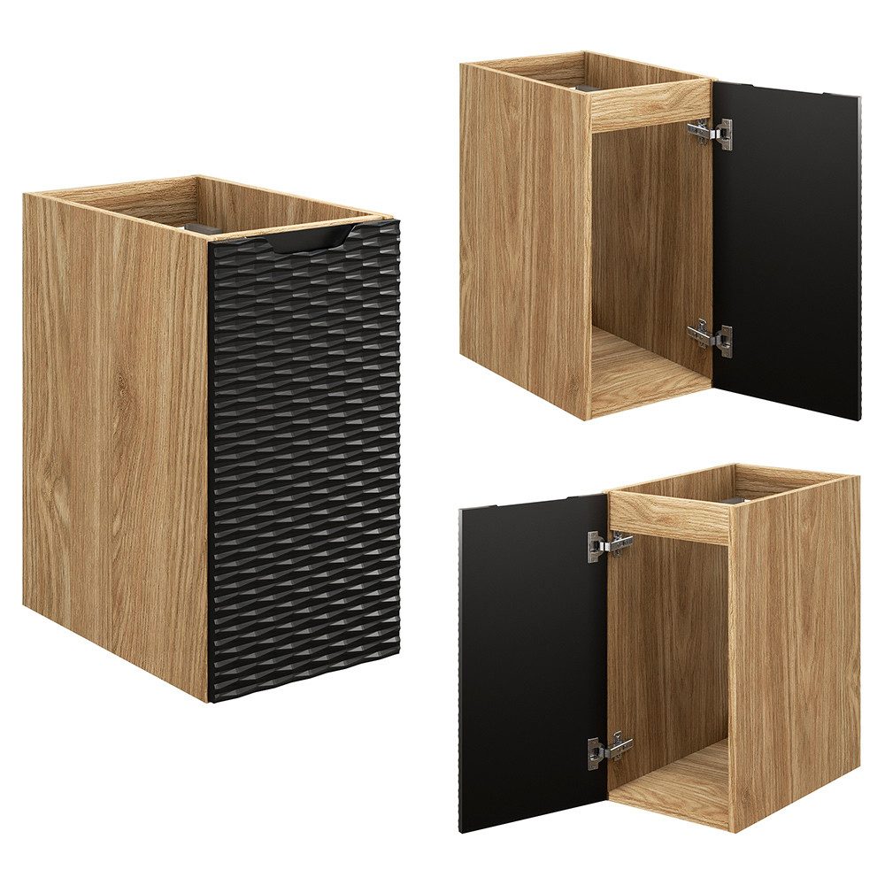 Der Korpus in Eiche und die grifflosen Fronten in schwarz mit einer 3D-Struktur in Wellenoptik bringen einen Hauch von Luxus in dein Badezimmer.