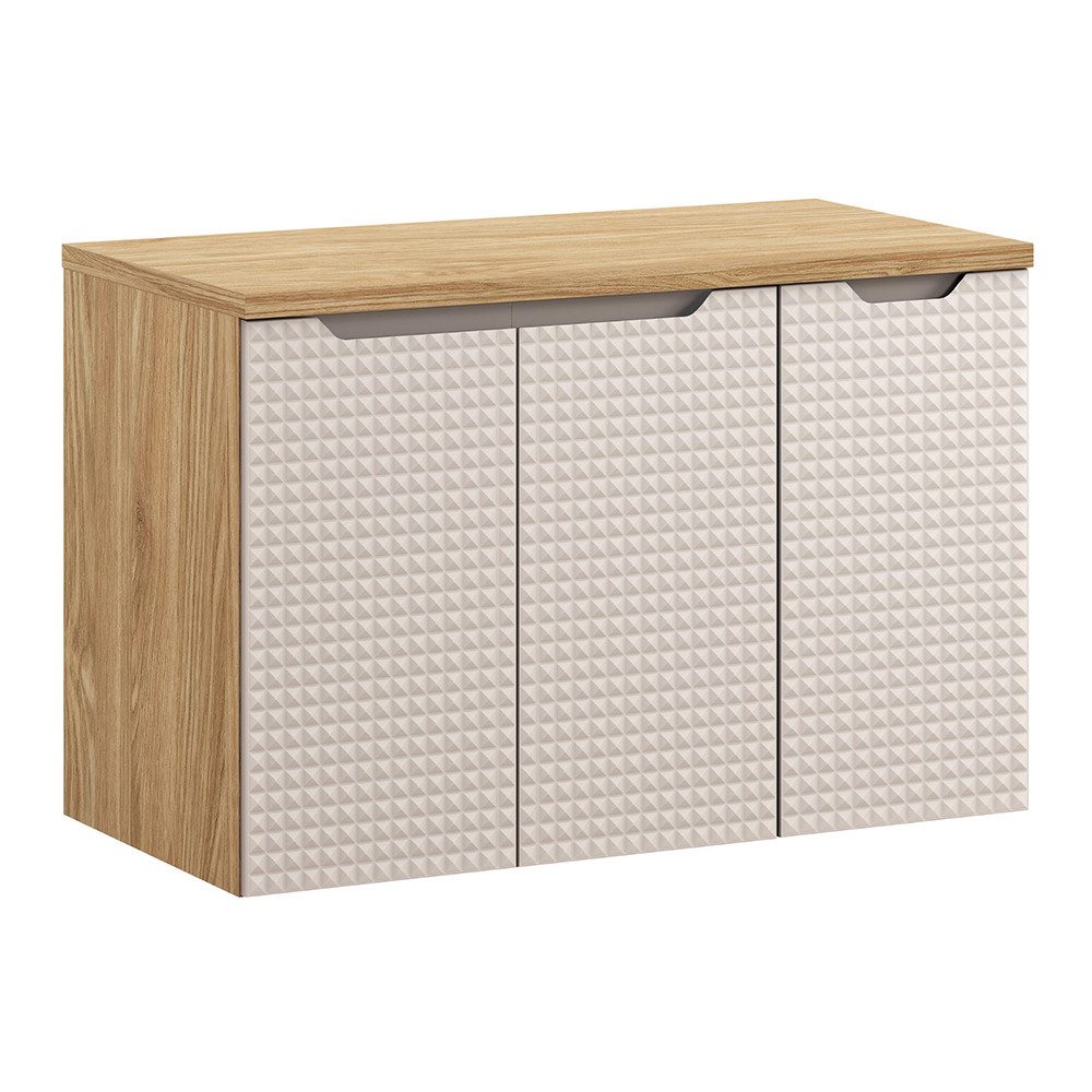 Erlebe unsere elegante Badmöbelserie, die durchdachtes Design und praktischen Komfort in deinem Badezimmer vereint. Die rustikale Eiche kombiniert mit den grifflosen, hellen Fronten der Schränke schafft einen ansprechenden Kontrast. Все Elemente sind mit Softclose-Türen und -Schubladen ausgestattet, die für eine leise und sanfte Handhabung sorgen.