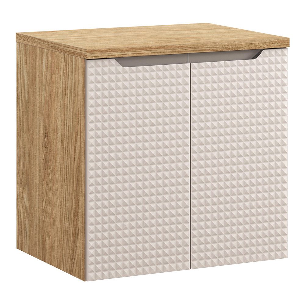 Erlebe unsere elegante Badmöbelserie, die durchdachtes Design und praktischen Komfort in deinem Badezimmer vereint. Die rustikale Eiche kombiniert mit den grifflosen, hellen Fronten der Schränke schafft einen ansprechenden Kontrast. Все Elemente sind mit Softclose-Türen und -Schubladen ausgestattet, die für eine leise und sanfte Handhabung sorgen.