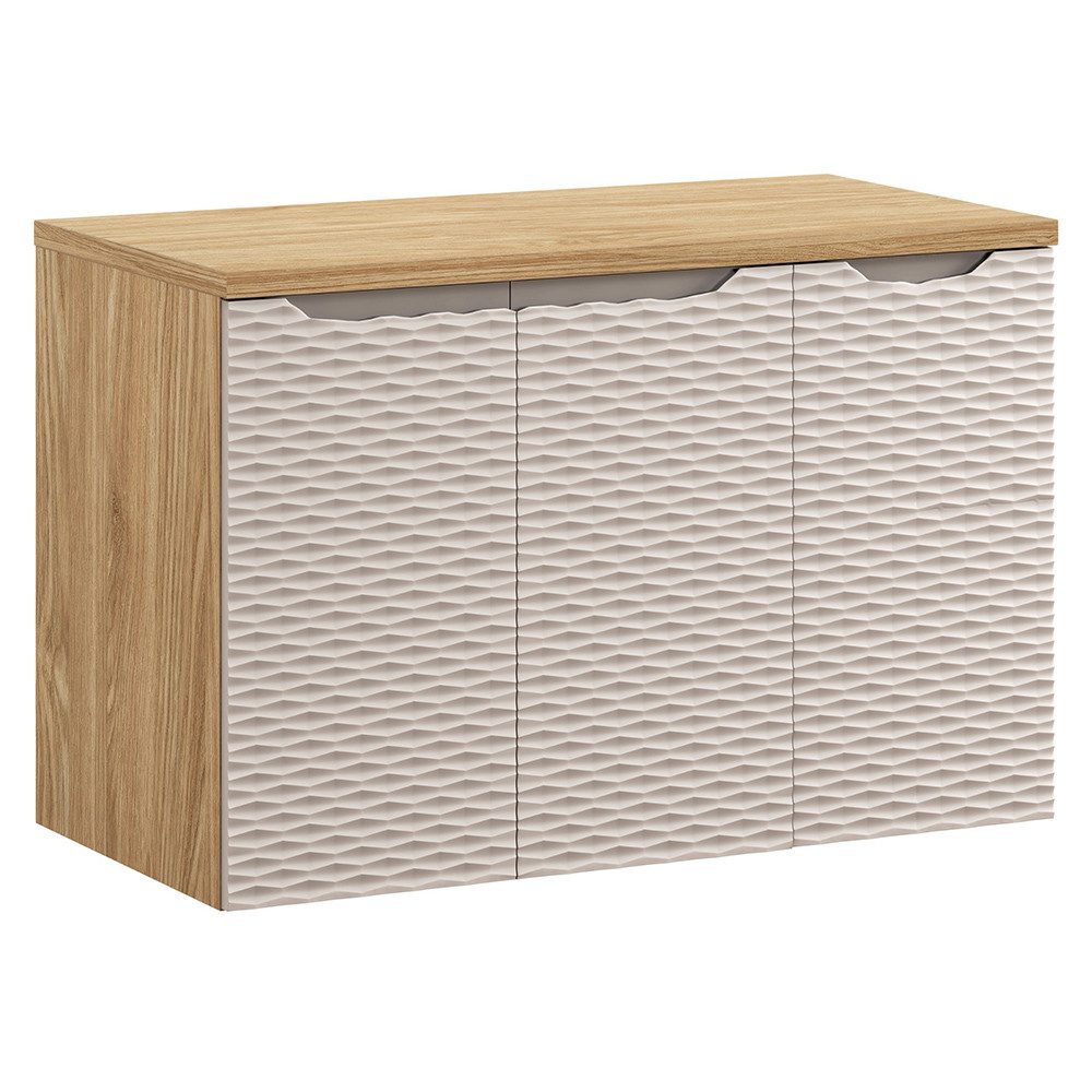 Der Korpus in Eiche und die grifflosen Fronten in beige mit einer 3D-Struktur in Wellenoptik bringen einen Hauch von Luxus in dein Badezimmer.
