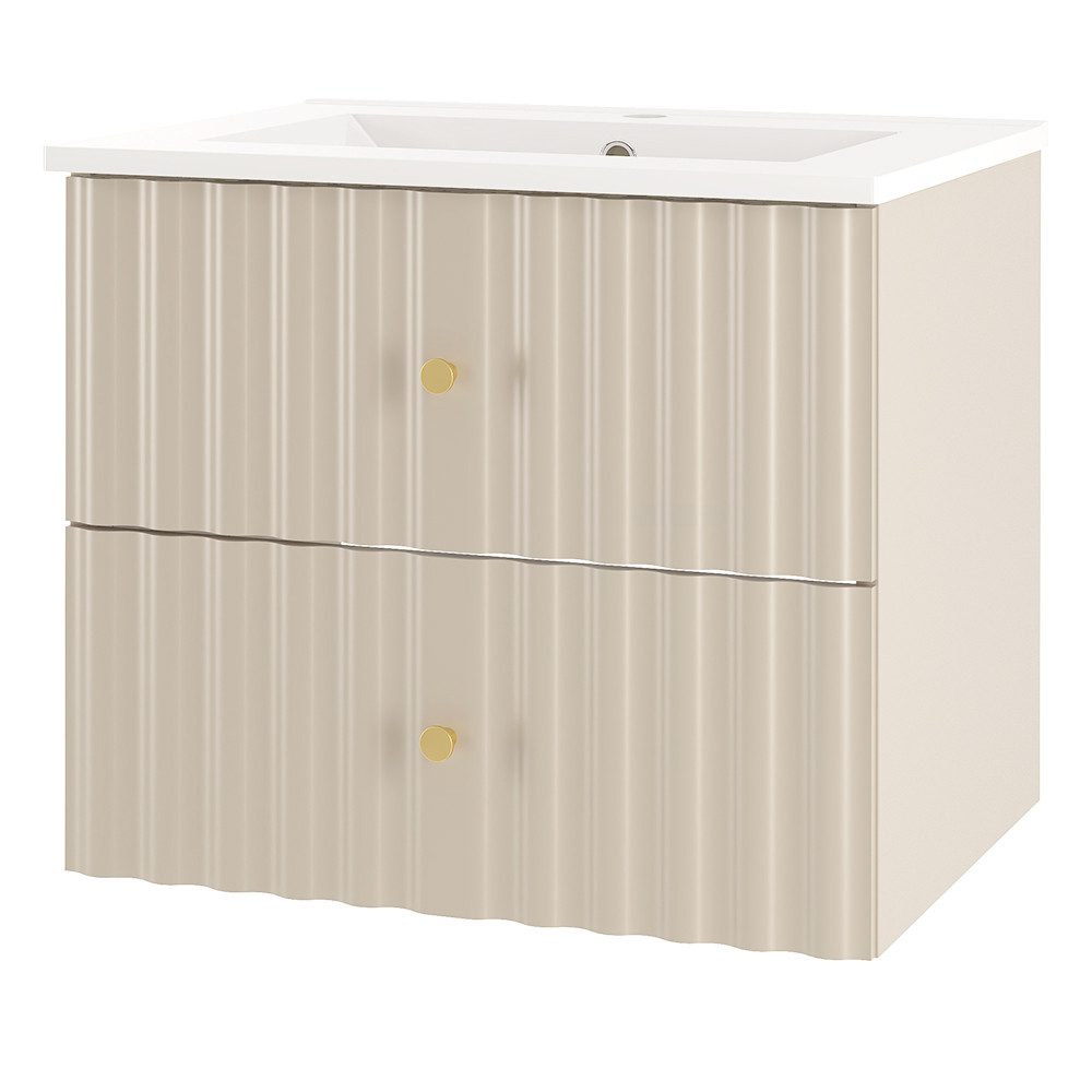 Verleihe deinem Badezimmer einen frischen Look mit unserer stilvollen Möbelserie in kaschmir. Die gerillte Front und die goldfarbenen Griffe verleihen den Schränken eine elegante und moderne Note, die für ein edles Ambiente sorgt. Dank der Softclose-Funktion schließen die Schubladen sanft und geräuschlos. Die Möbel bieten außerdem großzügigen Stauraum und setzen gleichzeitig luxuriöse Akzente.