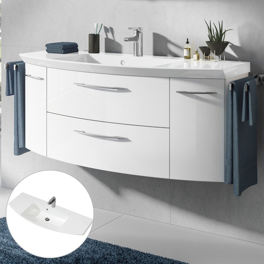 Diese Badmöbel-Serie wird Sie begeistern! Hohe Qualität zeichnet diese in Deutschland produzierten Möbel aus. Die Schubkästen bei dem Waschtischunterschrank und den Hängeschränken sind mit Soft-Close-Einzug ausgestattet. Die Türen haben ebenfalls Türdämpfung, für besonders geräuscharmes Спрятать. Die Fronten sind aus hochwertigem MDF gefertigt. Doch das Beste ist, dass Sie diese vormontierten Badezimmer Möbel besonders schnell geliefert bekommen.