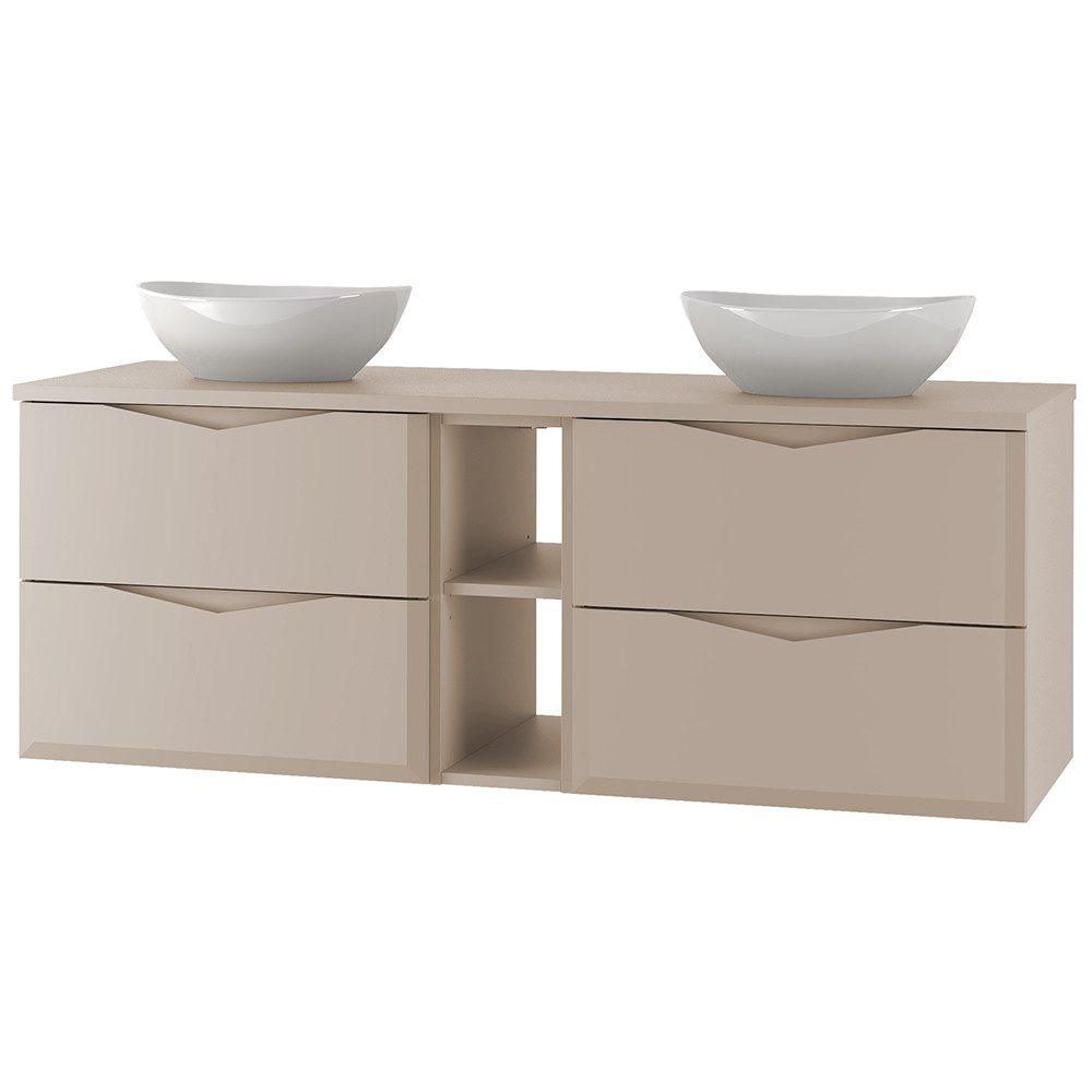 Dieser 140 cm breite Waschtisch kombiniert großzügigen Stauraum mit einem eleganten, modernen Design. Die sanfte Kaschmirfarbe und die grifflosen Fronten mit leicht angeschrägten Kanten, die an einen Facettenschliff erinnern, verleihen dem Möbelstück eine klare und stilvolle Optik, die deinem Bad eine ruhige und einladende Atmosphäre gibt. Das langlebige Keramik-Waschbecken ist pflegeleicht und ideal für den täglichen Gebrauch. Zwei offene Fächer bieten Platz für dekorative Elemente oder zusätzliche Ablagefläche, während vier geräumige Softclose-Schubladen ausreichend Stauraum für Handtücher, Pflegeprodukte und andere Badutensilien schaffen.