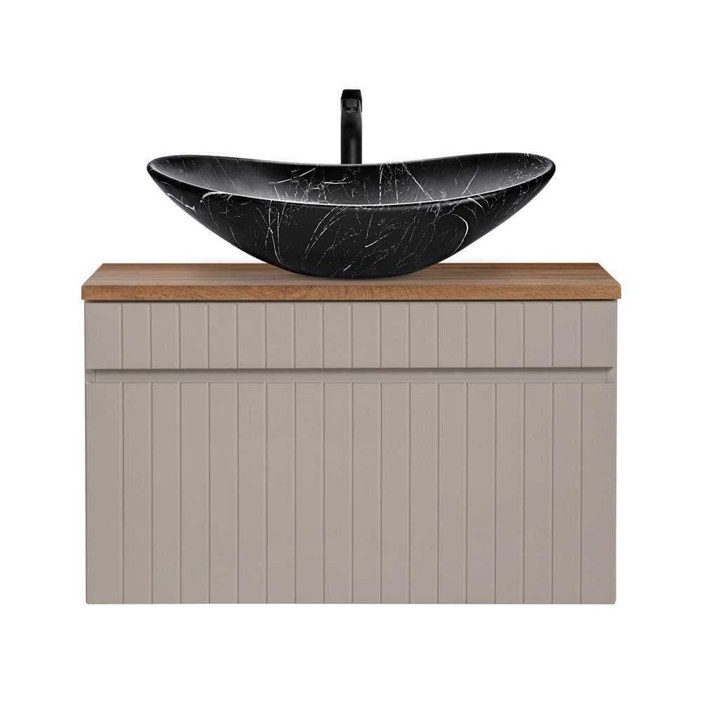 Der Waschtisch der Serie IRAKLIO-56-CASHMERE in seinem eleganten Kaschmir-Ton und der Front im modernen Rillen-Design setzt stilvolle Akzente in deinem Badezimmer. Die Waschtischplatte in Eiche Nb. und das stilvolle Keramik Aufsatzwaschbecken in schwarz matt mit Marmorierung runden das Gesamtbild perfekt ab.