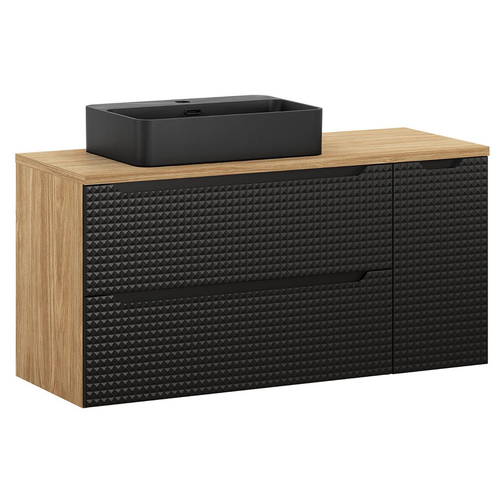 Erlebe unsere elegante Badmöbelserie, die durchdachtes Design und praktischen Komfort in deinem Badezimmer vereint. Die rustikale Eiche kombiniert mit den grifflosen, dunklen Fronten der Schränke schafft einen ansprechenden Kontrast. Все Elemente sind mit Softclose-Türen und -Schubladen ausgestattet, die für eine leise und sanfte Handhabung sorgen.