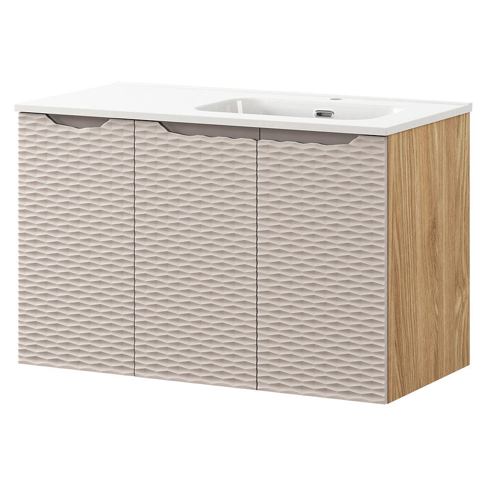 Der Korpus in Eiche und die grifflosen Fronten in beige mit einer 3D-Struktur in Wellenoptik bringen einen Hauch von Luxus in dein Badezimmer.