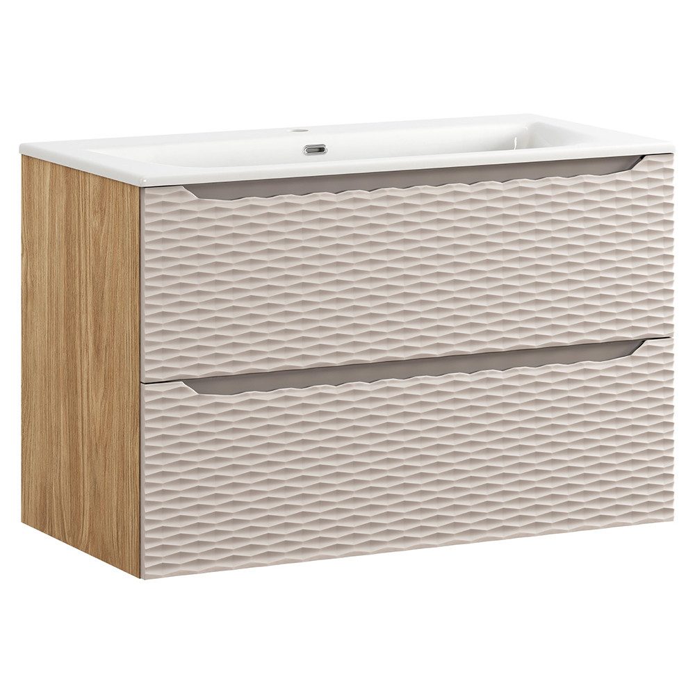 Der Korpus in Eiche und die grifflosen Fronten in beige mit einer 3D-Struktur in Wellenoptik bringen einen Hauch von Luxus in dein Badezimmer.