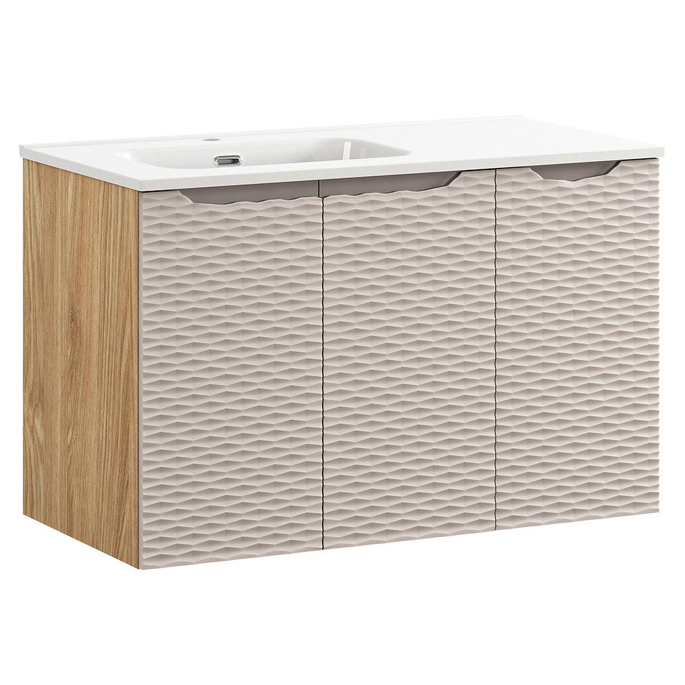 Der Korpus in Eiche und die grifflosen Fronten in beige mit einer 3D-Struktur in Wellenoptik bringen einen Hauch von Luxus in dein Badezimmer.