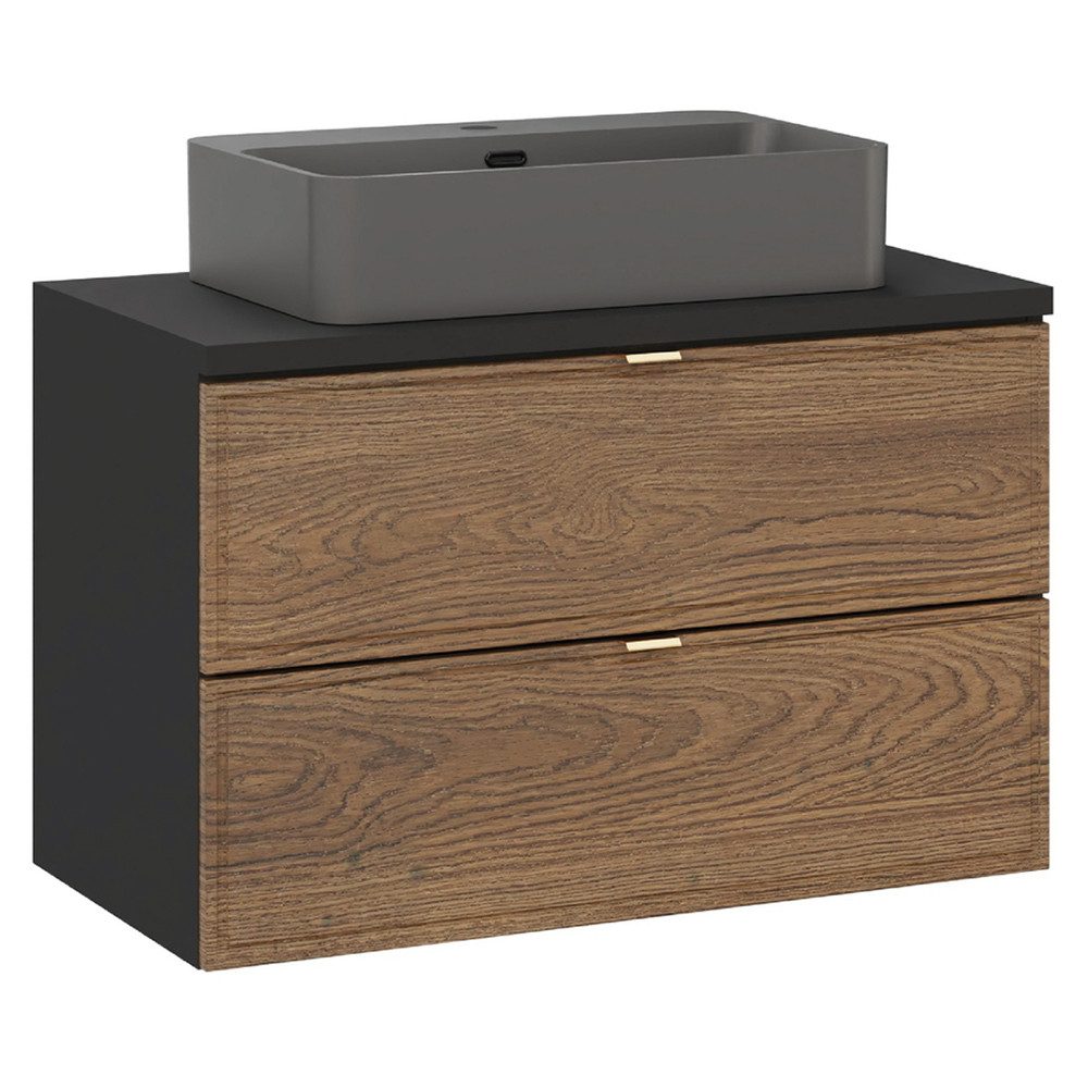 Die Front in Casella Eiche Nachbildung verleiht eine warme, natürliche Holzoptik, während der matte schwarze Korpus eine elegante Tiefe schafft. Zwei großzügige Schubladen bieten viel Stauraum für Pflegeprodukte und schließen dank Softclose sanft und leise. Mit 80 cm Breite ist dieser Waschtisch ideal für mittelgroße bis große Bäder.
