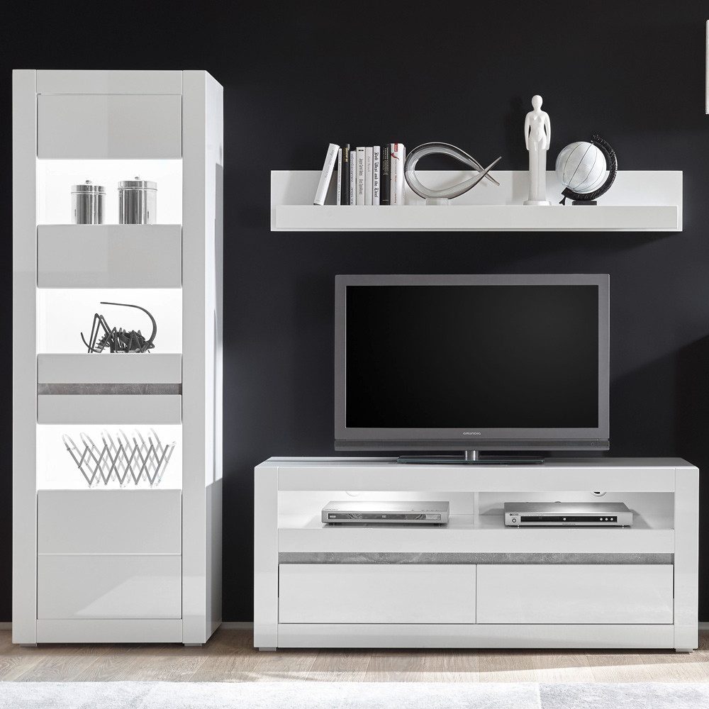 Mit dieser ultra modernen Wohnzimmer-Möbel-Serie COGO-61 mit Fronten in weiß Hochglanz und einmaligen Griffmulden / Zierleisten in Betonoptik liegen Sie im Trend und verleihen Ihrer Wohnung ein elegantes Erscheinungsbild. Die Oberflächen sind pflegeleicht, die Möbel bieten viel Stauraum und Türen als auch Schubladen sind mit Soft-Close-System ausgestattet.