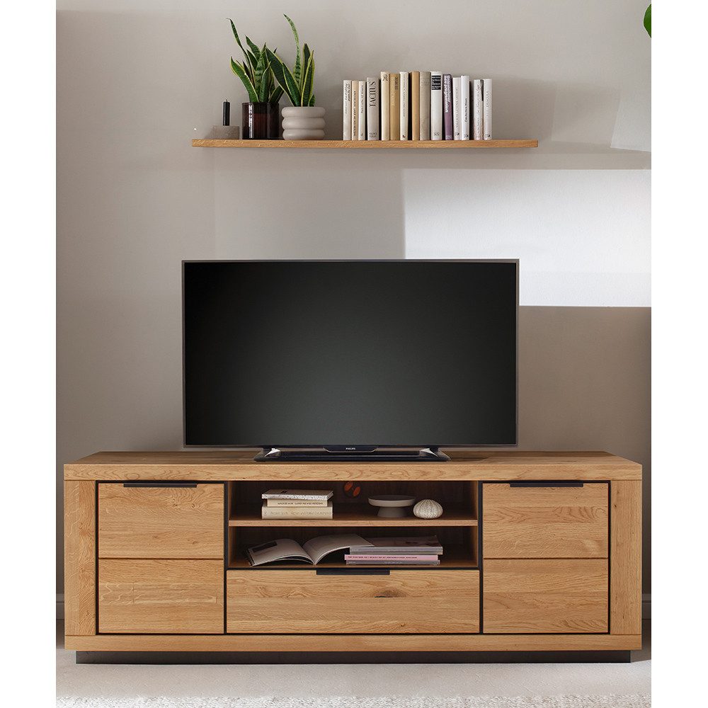 Die massiven, geölten Fronten kombiniert mit einem Korpus in Wildeiche Nachbildung verleihen jedem Raum Wärme und Eleganz. Metallgriffe unterstreichen das zeitlose Design, während die individuell kombinierbaren Elemente dir maximale Flexibilität bieten.